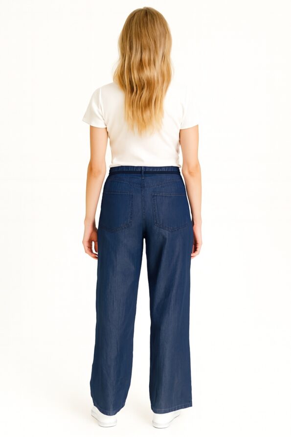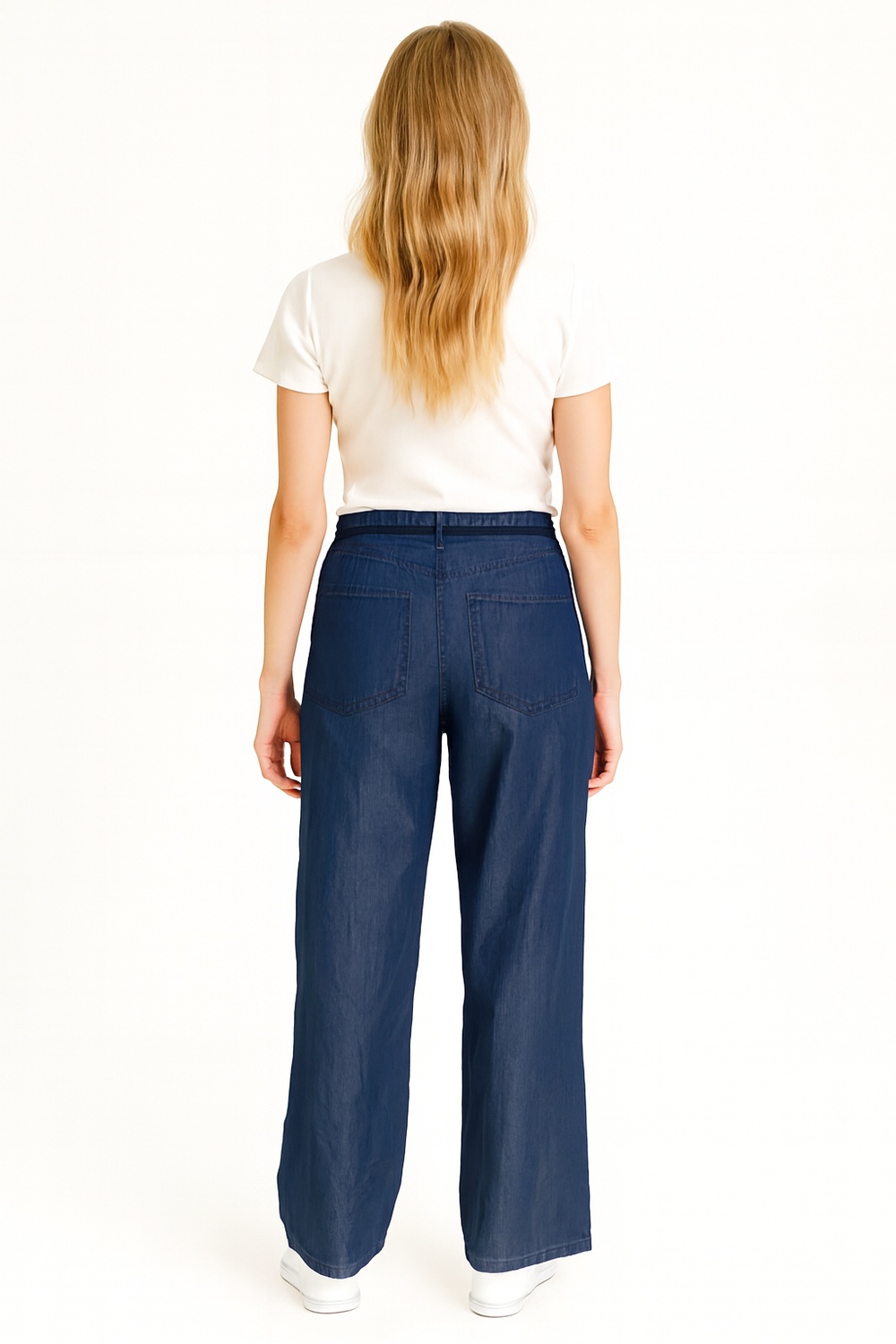 Jeans de tiro alto con corte amplio que brinda comodidad y libertad de movimiento, diseño de cinco bolsas funcionales que aporta practicidad, confeccionados en mezclilla resistente con textura suave que conserva su forma, pretina con trabillas y cierre frontal con botón metálico
