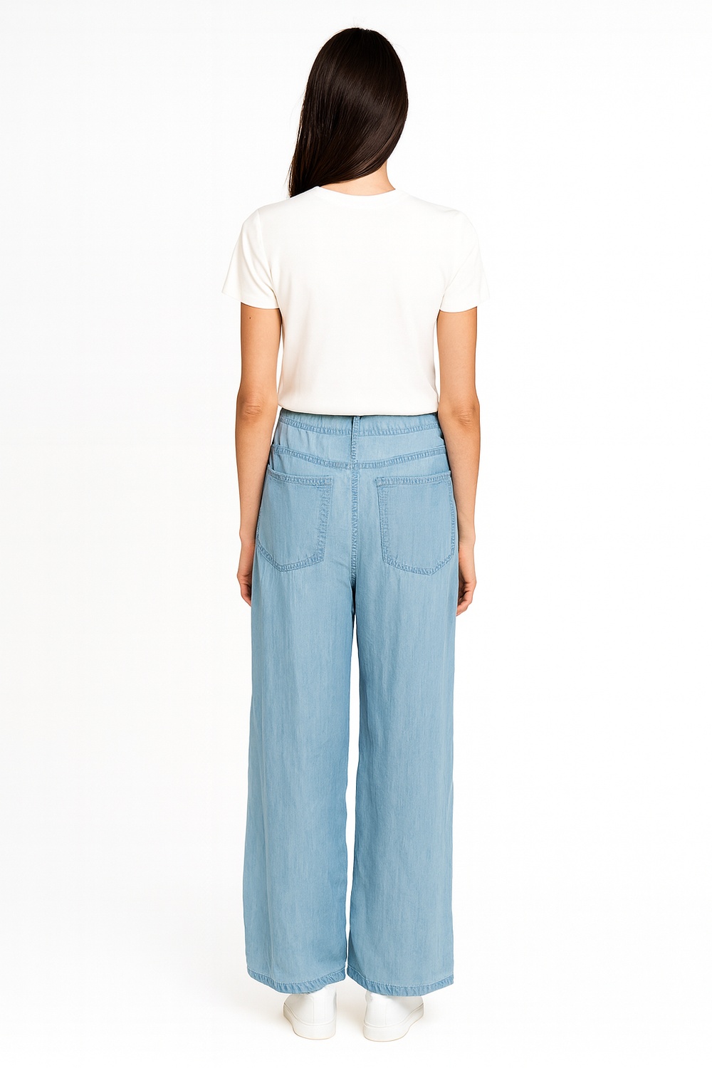 Jeans de tiro alto con corte wide leg que aporta un efecto visual alargado, diseño clásico de cinco bolsas que ofrece funcionalidad y estilo, confeccionados en mezclilla resistente con acabado suave al tacto, bastilla deshilada que añade un toque moderno