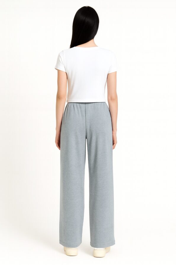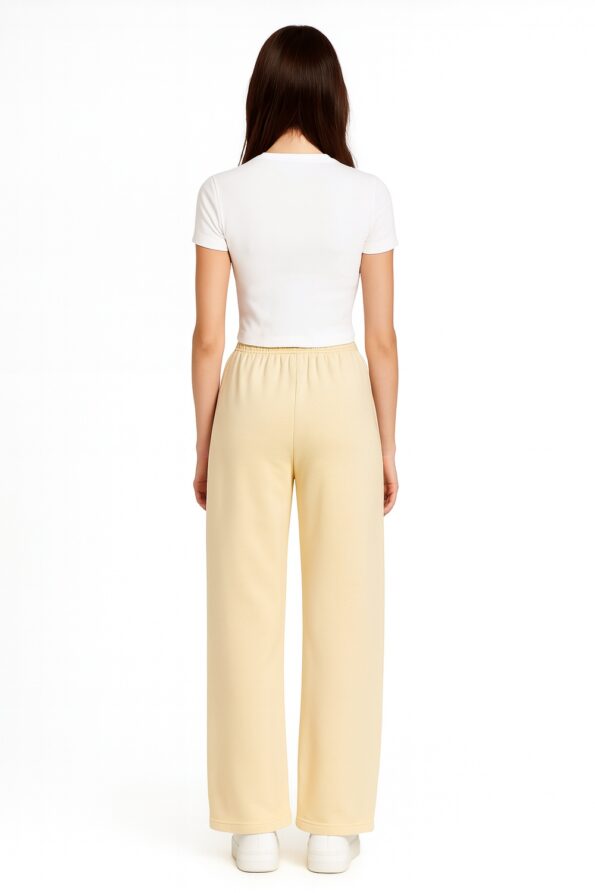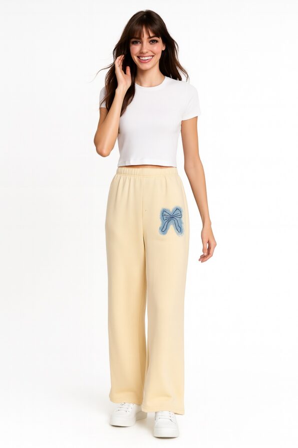 Pantalón de felpa con pretina elástica que brinda ajuste cómodo, aplicación decorativa de moño al costado que añade un detalle femenino y moderno, corte recto que favorece la libertad de movimiento, tejido afelpado de tacto suave que ofrece calidez y confort, terminaciones limpias que conservan la forma y aportan un acabado casual y versátil
