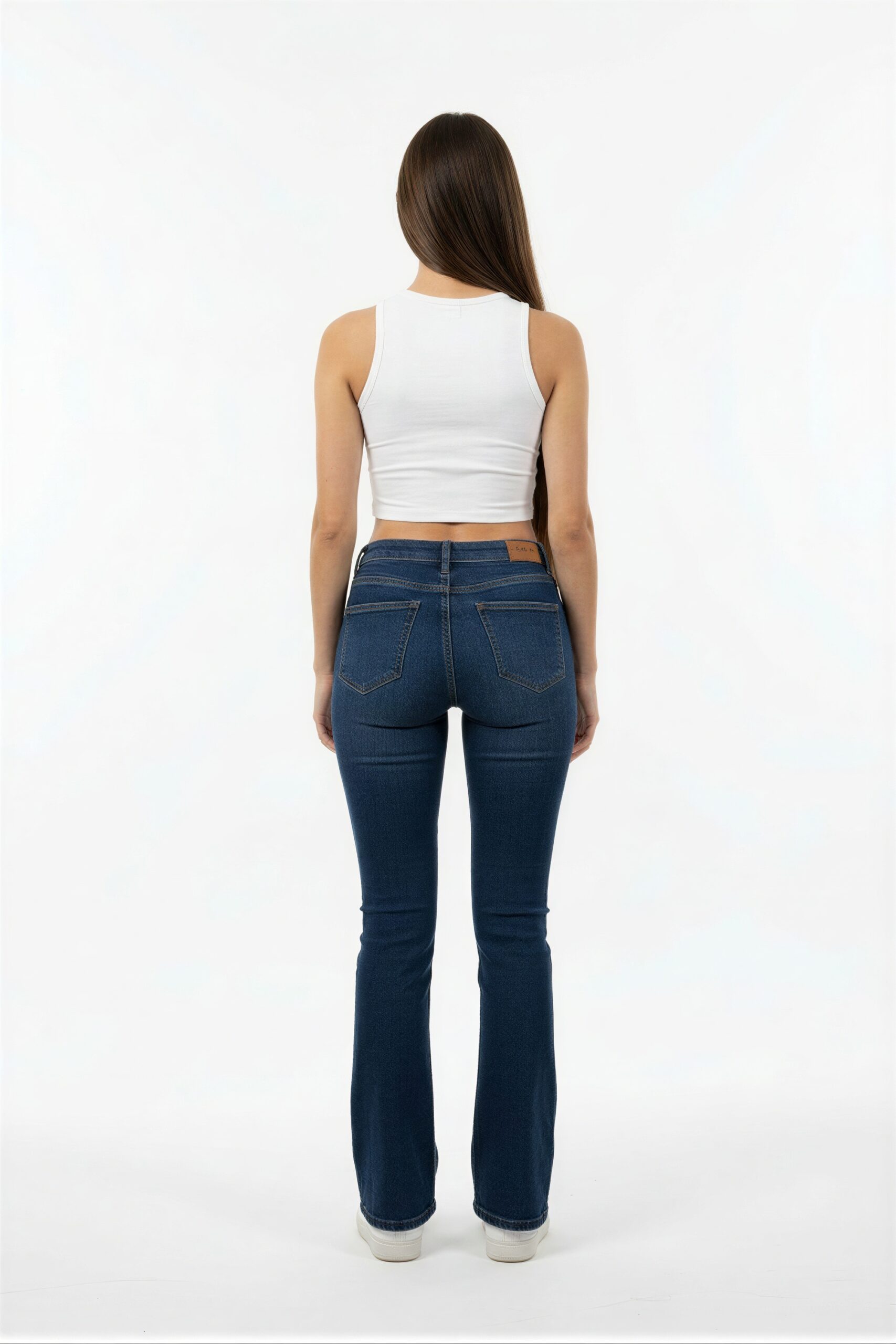 Pantalón de mezclilla con pretina de botón y cierre, cinco bolsillos funcionales, corte recto con ajuste favorecedor, confección resistente para uso continuo