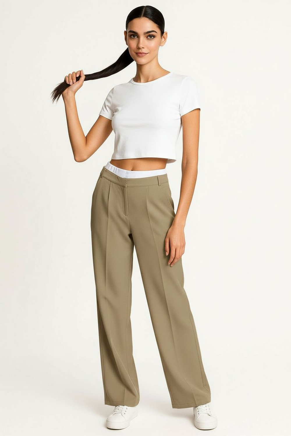 Pantalón de tiro alto con pretina estructurada que brinda soporte y ajuste cómodo, corte recto en pierna que estiliza la silueta, cierre frontal oculto para apariencia limpia, largo al tobillo que facilita su uso diario, confección en tejido resistente de tacto suave