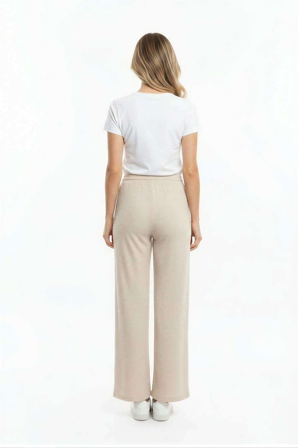 Pantalón de corte recto con caída amplia que brinda comodidad al caminar, cintura con resorte que permite ajuste práctico, detalle de jare que facilita la adaptación al cuerpo, largo a la altura del tobillo que aporta versatilidad, confección en tejido suave que proporciona libertad de movimiento