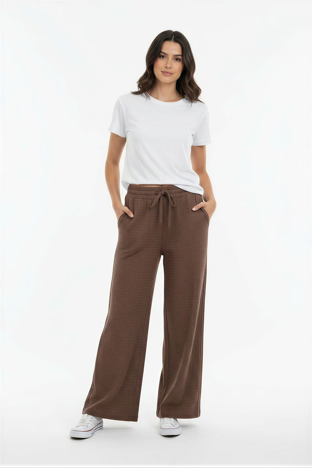 Pantalón en tejido rib con pretina elástica y jareta ajustable que brinda soporte cómodo en cintura, corte ajustado en muslo con apertura tipo campana en bajo que estiliza la silueta, confección flexible que permite libertad de movimiento y ajuste favorecedor