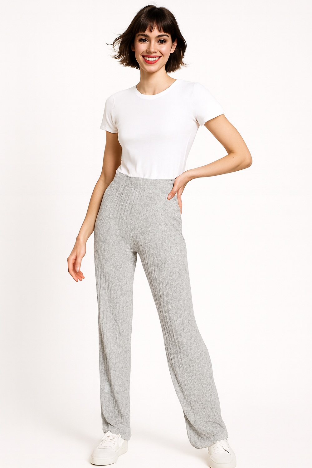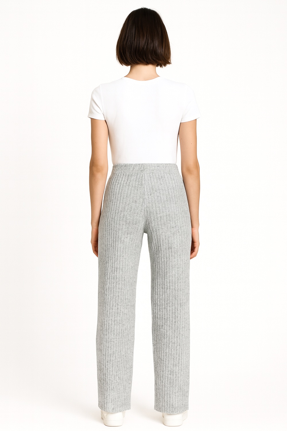 Pantalón de tejido rib con pretina ancha que asegura ajuste cómodo, corte amplio y ligeramente acampanado que estiliza y aporta movimiento, diseño versátil ideal para outfits casuales y relajados, confección en algodón con elastano que brinda frescura, elasticidad y confort