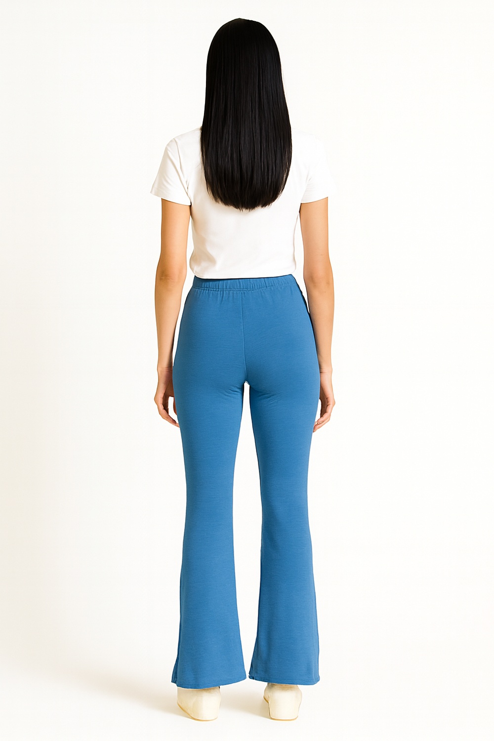 Pantalón confeccionado en tejido acanalado elástico, pretina ancha con jareta ajustable para mayor comodidad, corte de pierna tipo campana que alarga la figura, caída fluida que acompaña el movimiento, acabado suave con costuras reforzadas