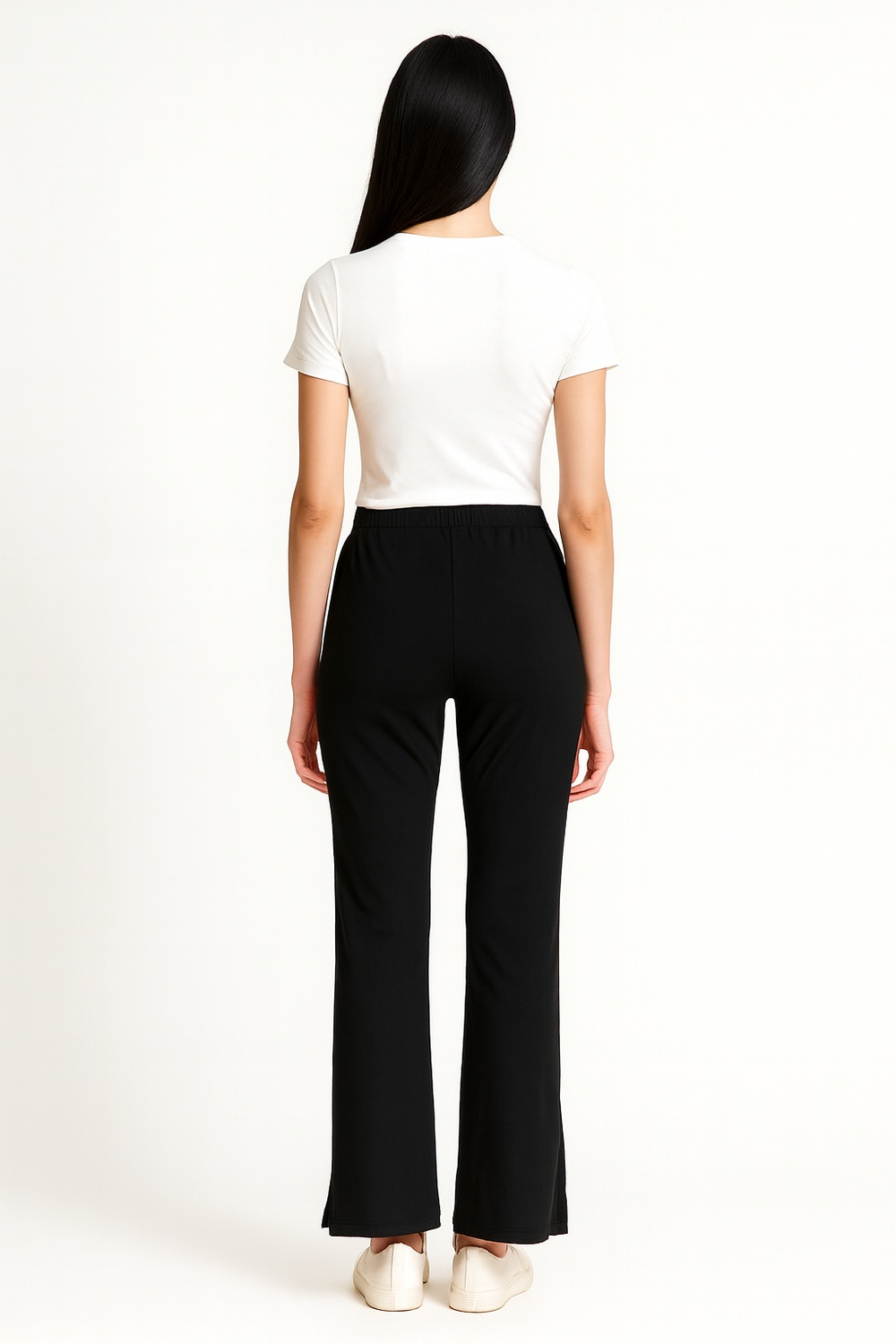 Pantalón confeccionado en tejido rib que aporta elasticidad cómoda, pretina ancha con ajuste seguro, pierna amplia que permite movilidad fluida, abertura lateral discreta que complementa caída, terminación limpia que mantiene estructura