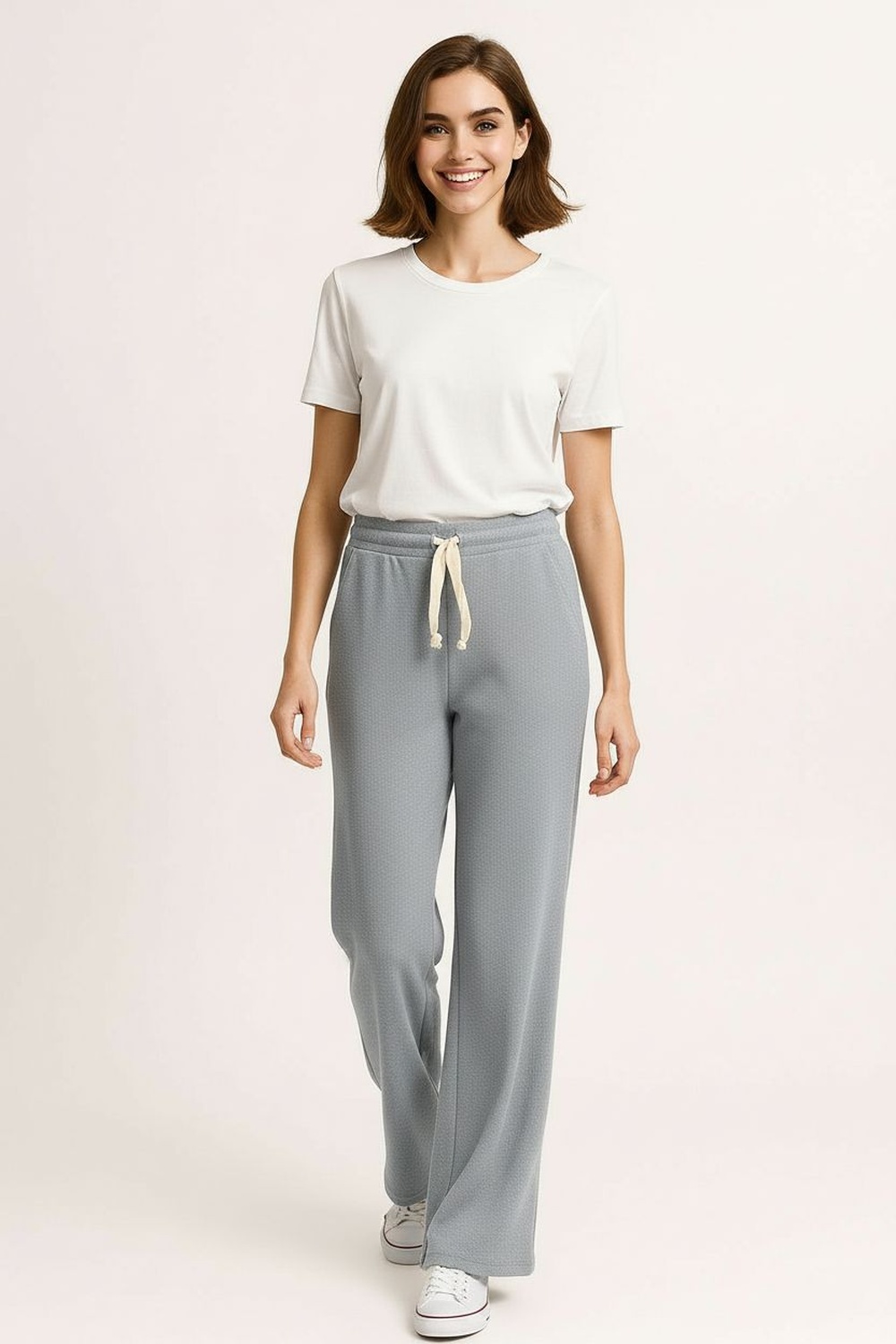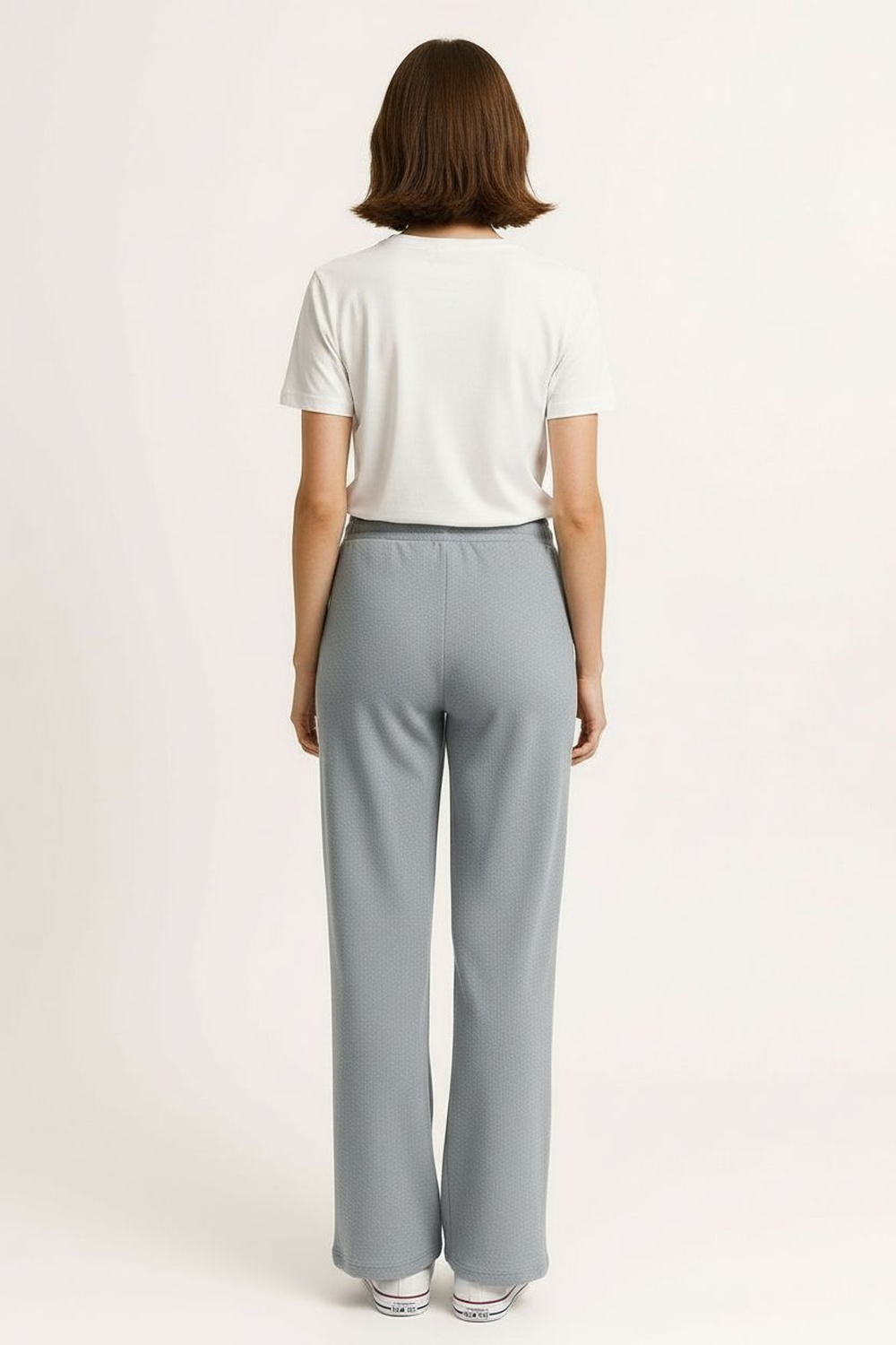Pantalón de corte suelto con tiro medio que ofrece comodidad continua, pretina elástica con ajuste fruncido que se adapta al cuerpo, pierna recta de caída relajada, confección en tejido tipo waffle que aporta textura y suavidad al tacto