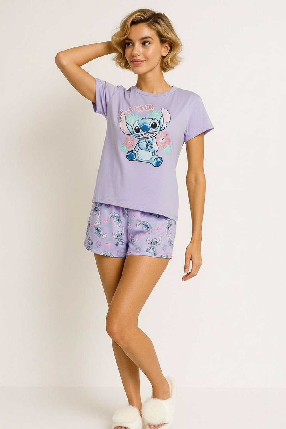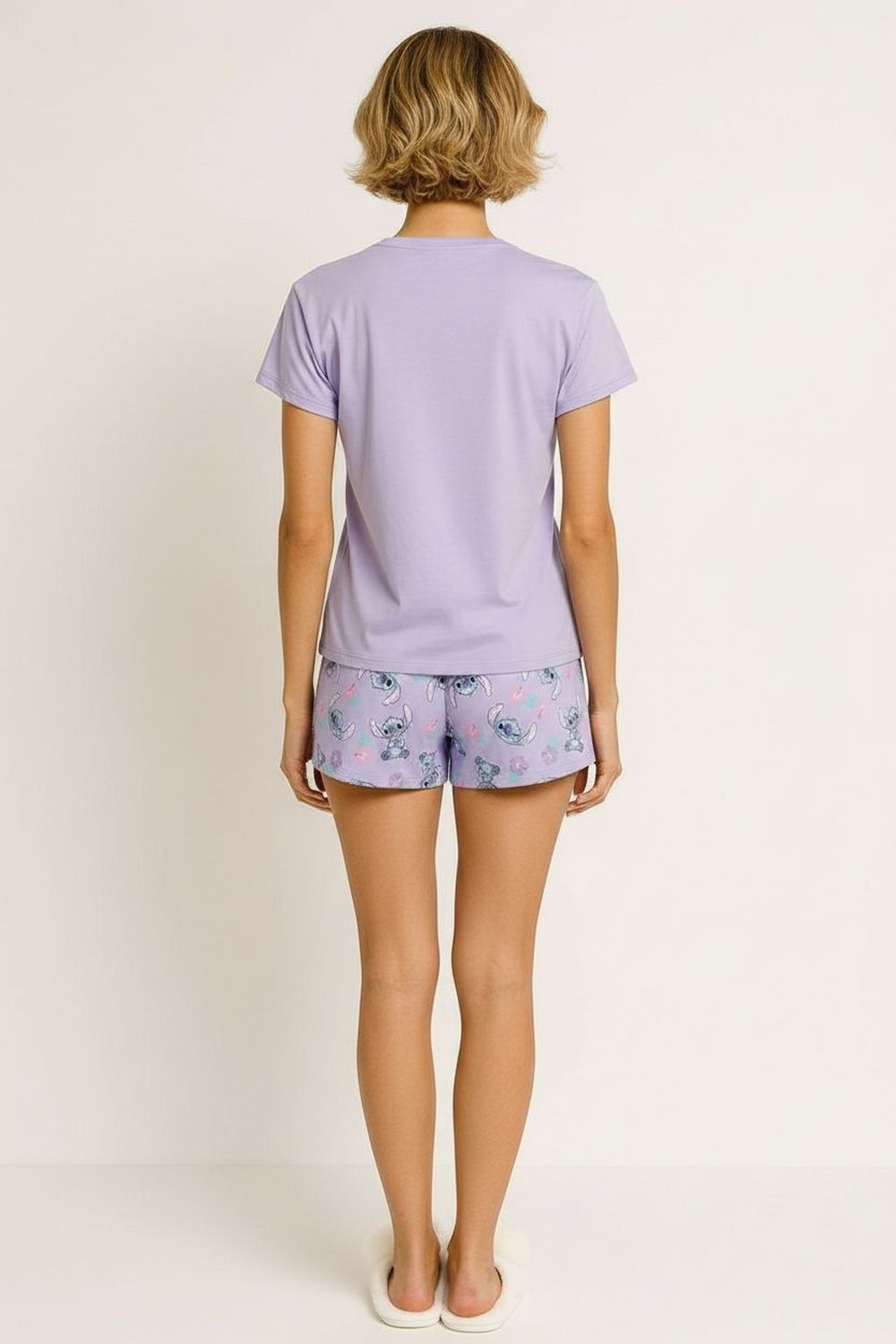 Pijama estampado licencia stitch, playera cuello redondo y manga corta, pantalón tiro medio con pretina delgada de elástico con cinta de amarre