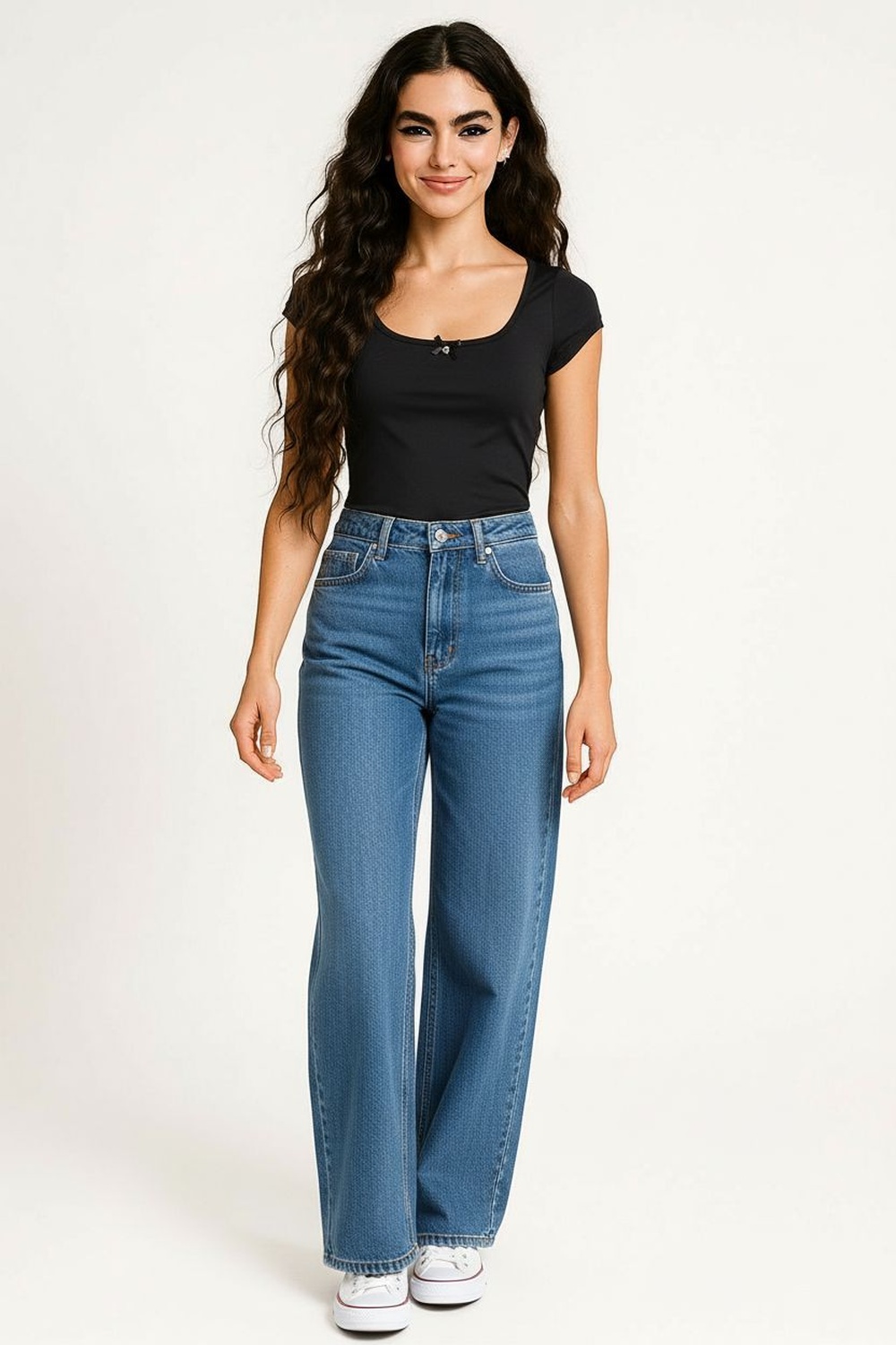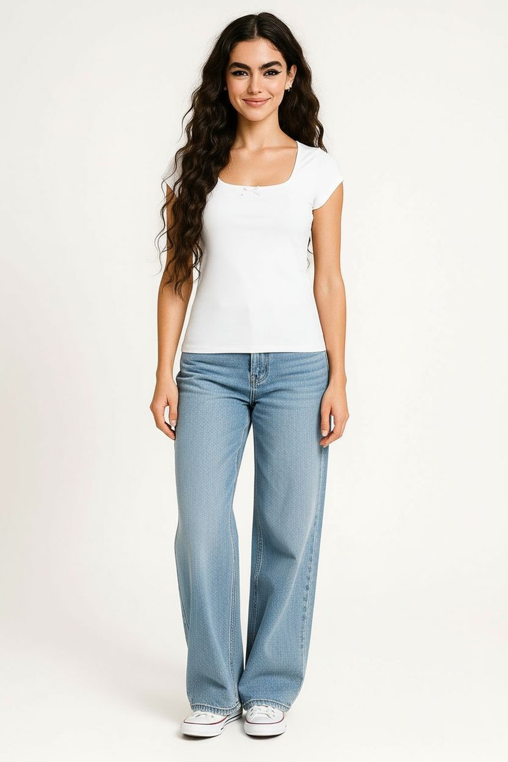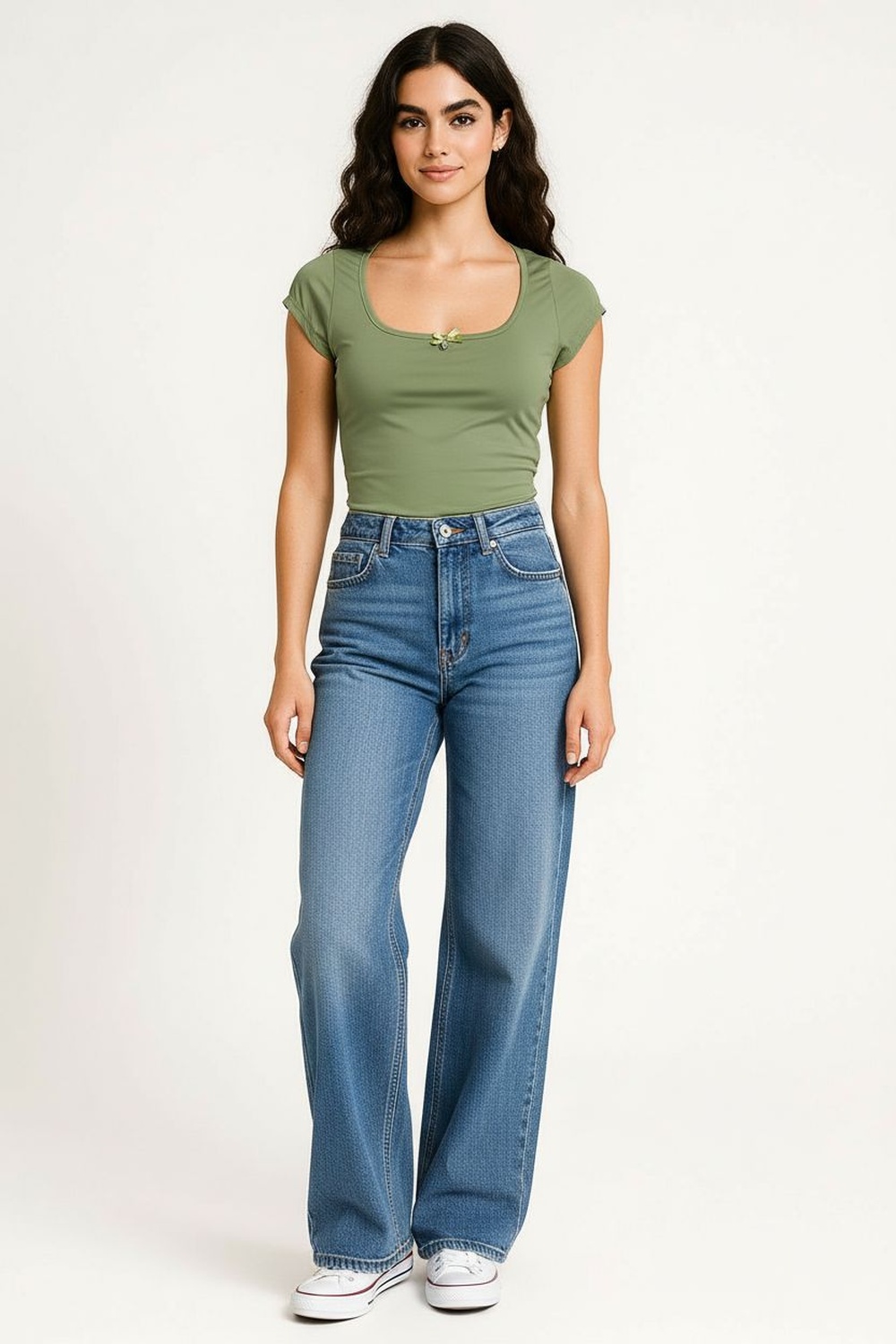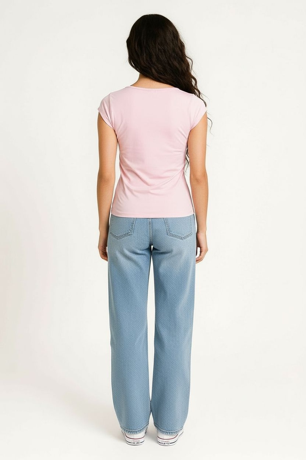 Playera de manga corta con escote amplio, ajuste al cuerpo, detalle decorativo frontal, acabado liso, confección en tejido elástico, estructura cómoda
