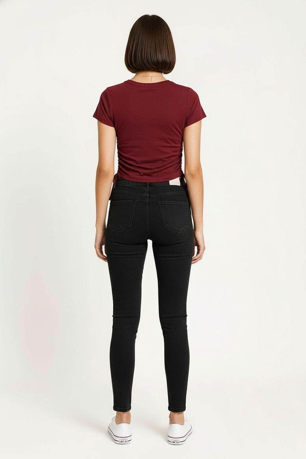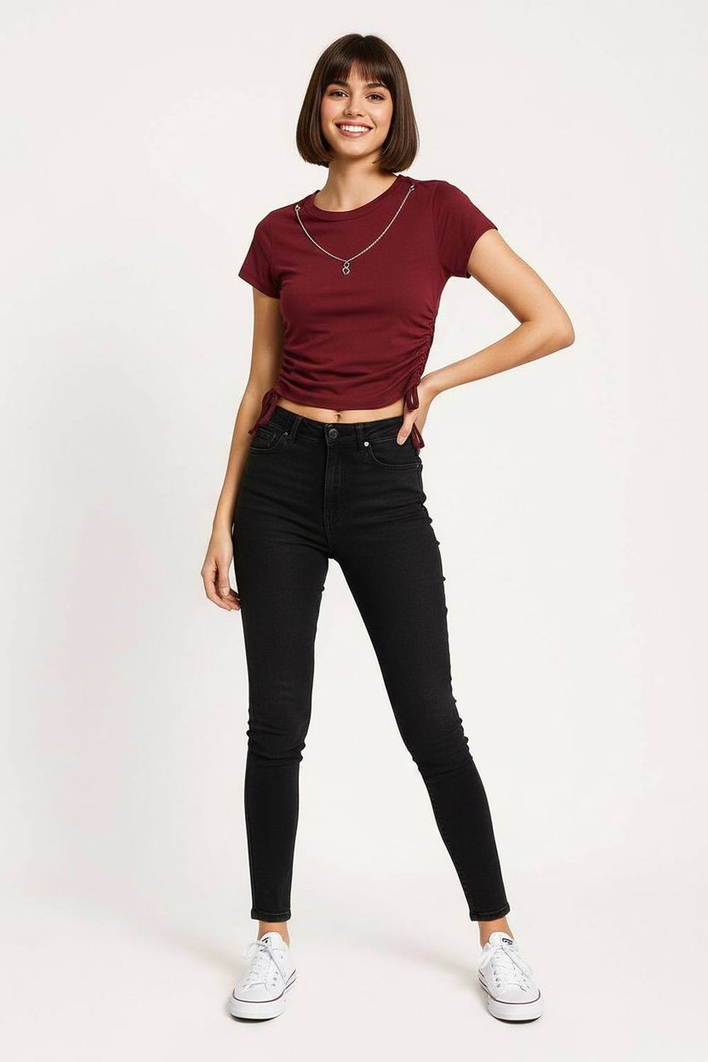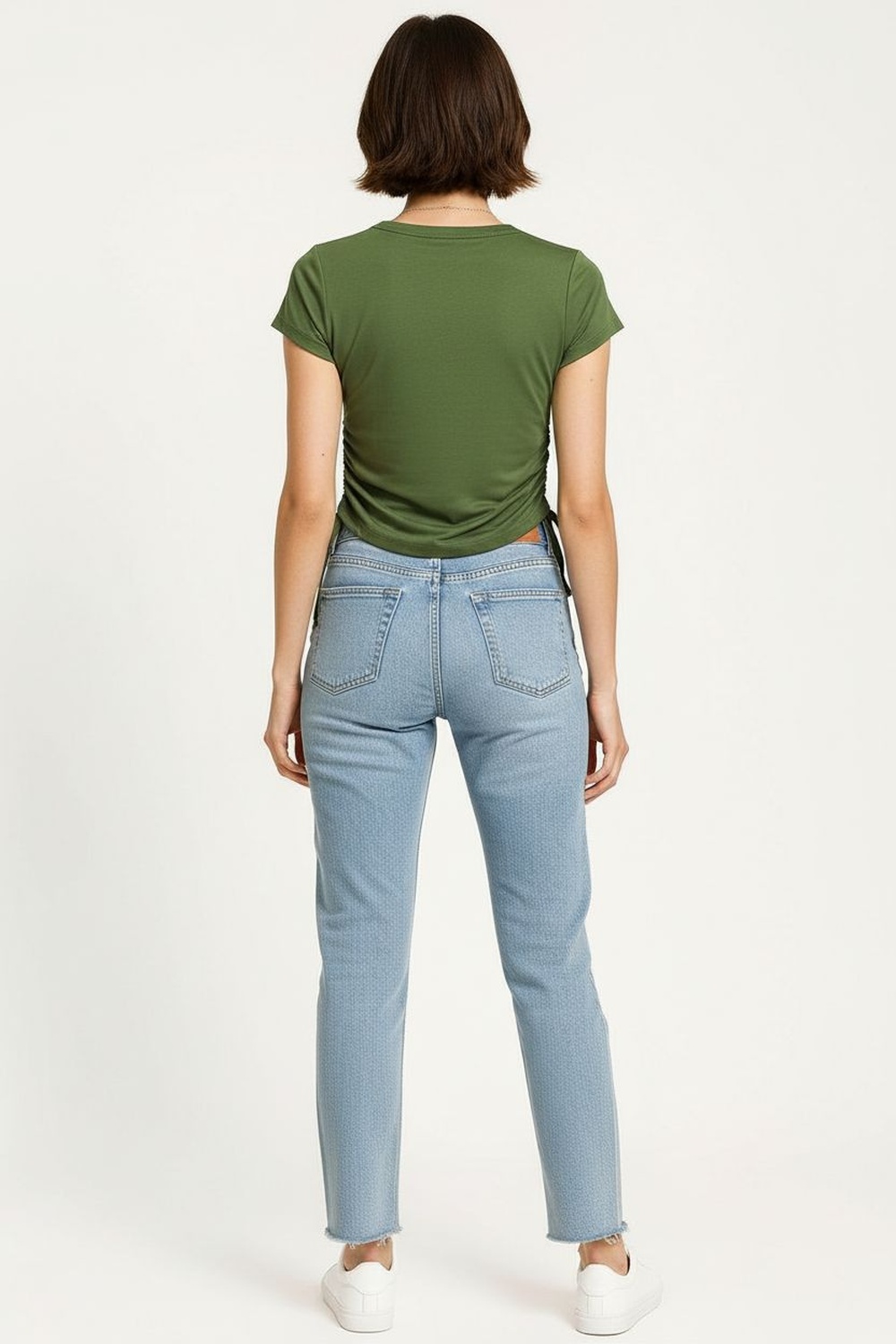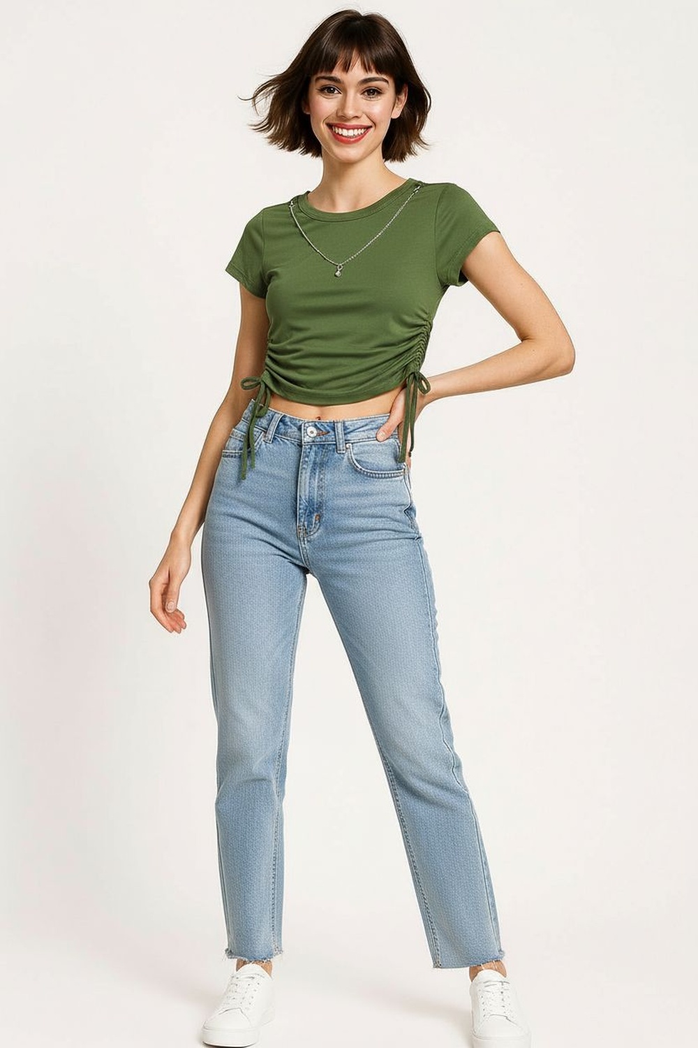 Playera de tejido suave con jaretas funcionales laterales que permiten ajustar el largo, cuello redondo y mangas cortas que aportan comodidad y movimiento, confección ligera y adaptable que se ajusta al cuerpo resaltando la silueta