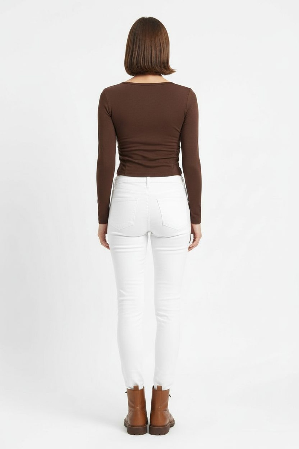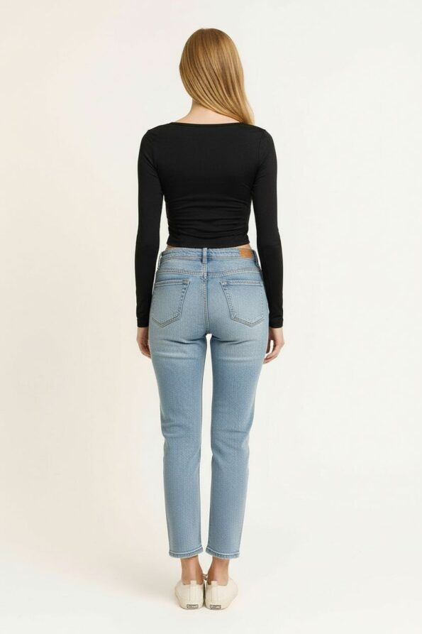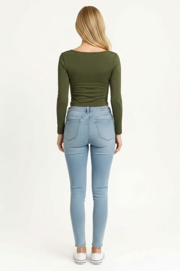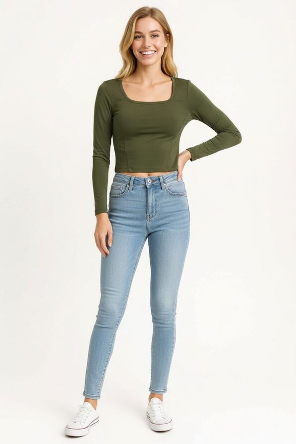 Playera de manga larga con corte ajustado que resalta la figura, cuello redondo amplio con terminación limpia que realza la zona del escote, diseño corto por encima de la cintura que aporta un look juvenil y moderno, confección en tela elástica que se adapta cómodamente al cuerpo brindando libertad de movimiento, acabado suave que asegura confort durante todo el día