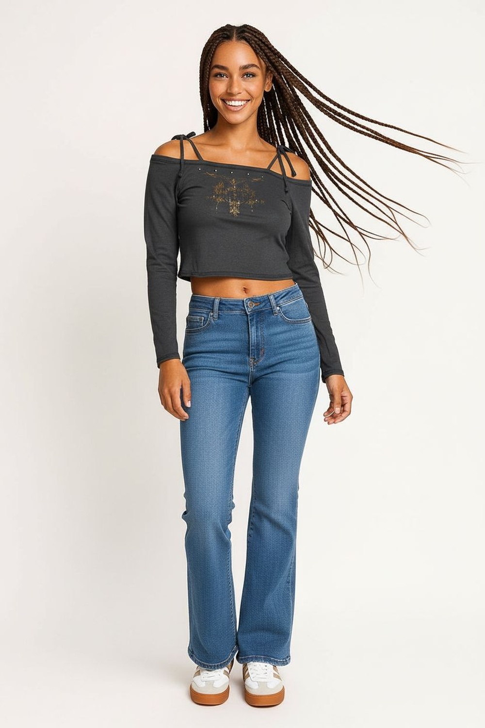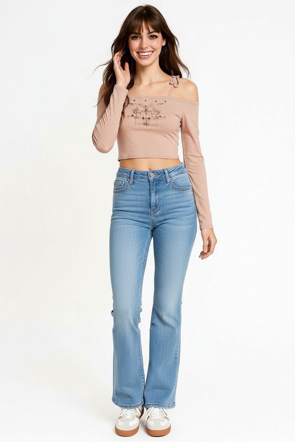 Playera de tiro corto con diseño al hombro que resalta la estructura superior, tiras delgadas ajustables que permiten regular el soporte, confección suave con acabado que aporta firmeza, largo a la cintura que facilita un look definido, diseño frontal con apliques metálicos distribuidos de forma simétrica, mangas largas que brindan cobertura ligera