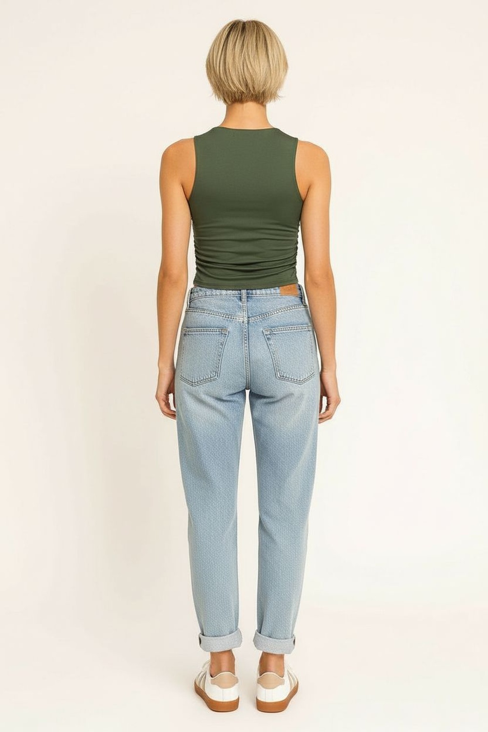 Playera sin mangas con cuello cerrado que aporta definición al escote, laterales con recogido fruncido que permite ajustar ligeramente el largo, confección de tejido firme que estructura la silueta, diseño corto que acentúa la parte superior del torso, acabado liso que brinda una imagen pulida