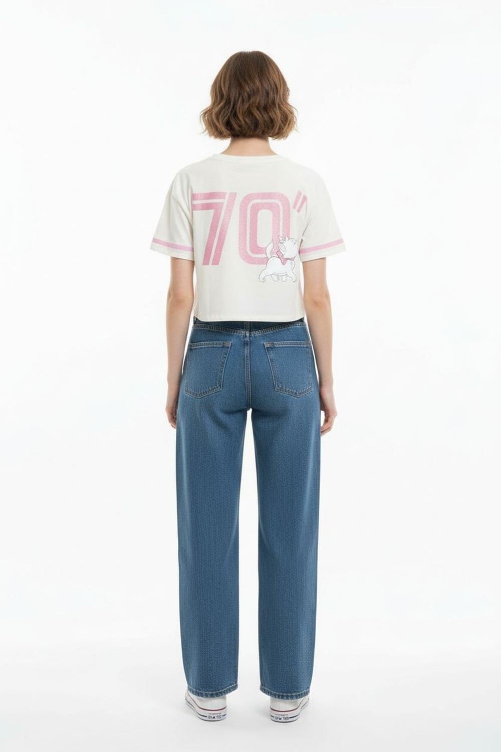 Playera amplia con cuello redondo, manga corta, ajuste suelto, largo arriba de la cintura, diseño con gráfico al frente y espalda, terminados limpios