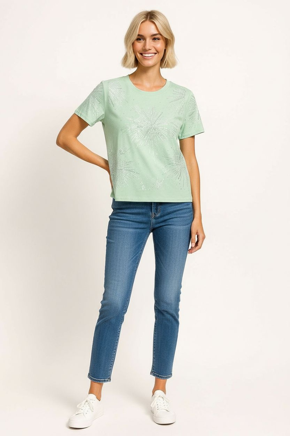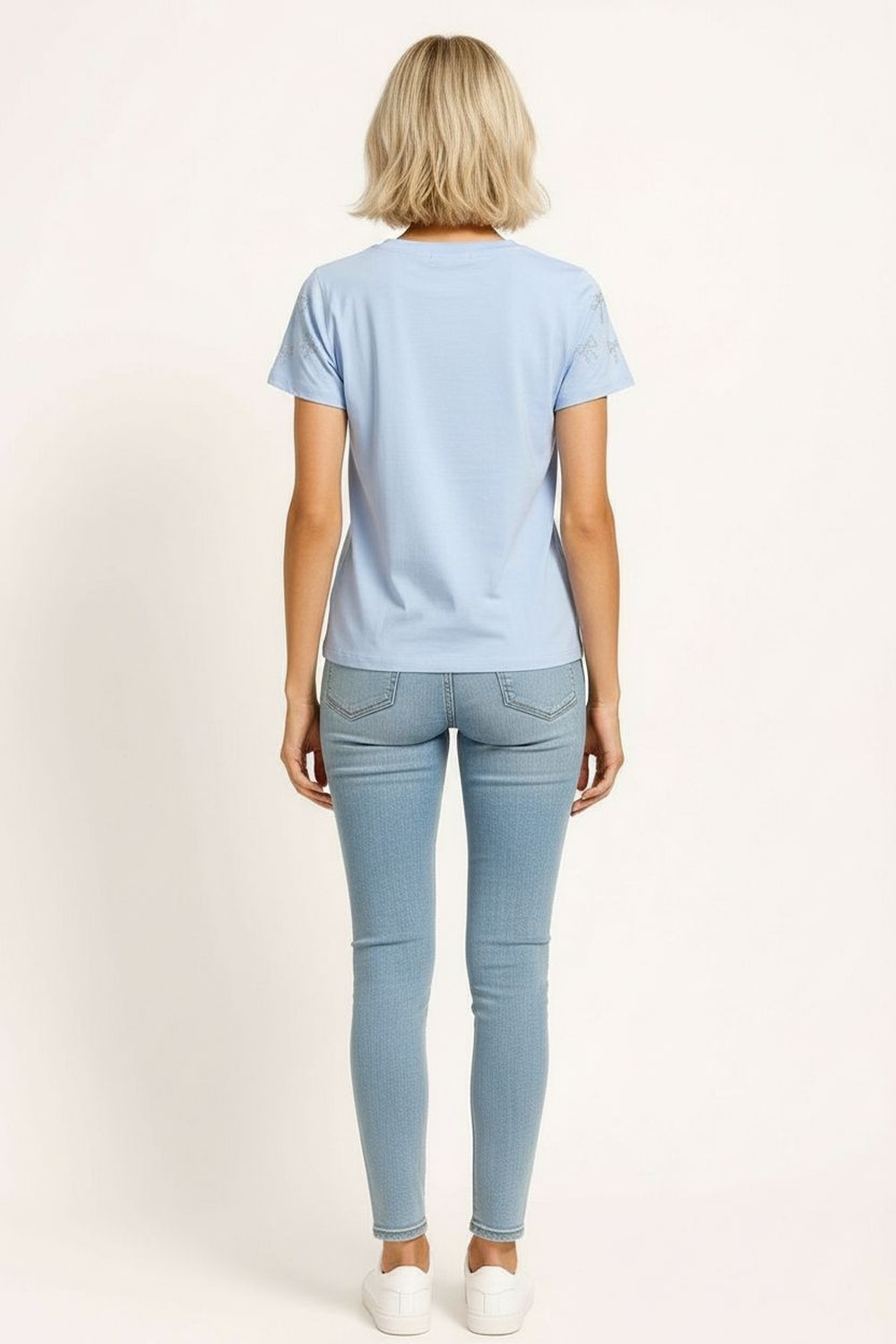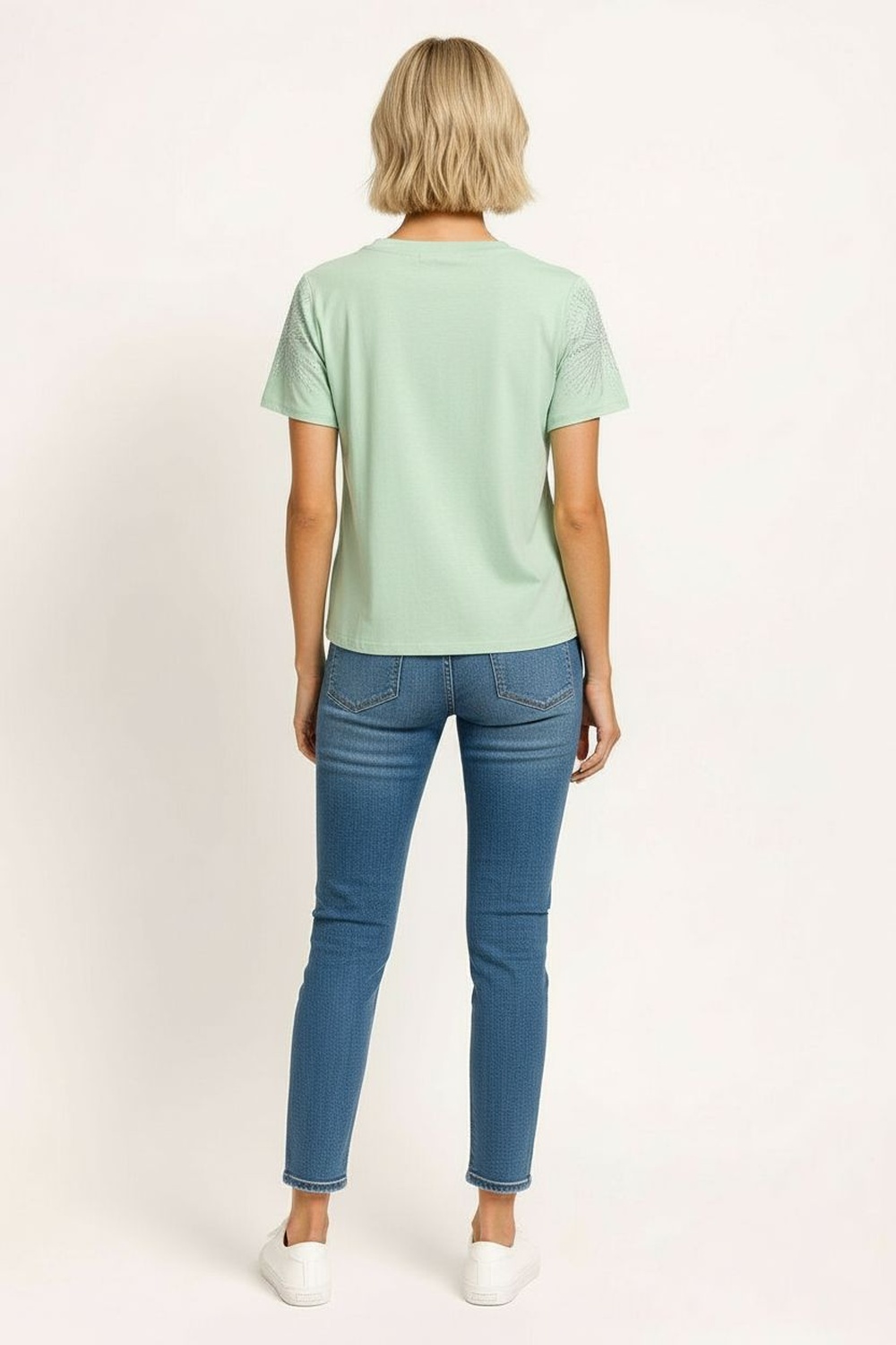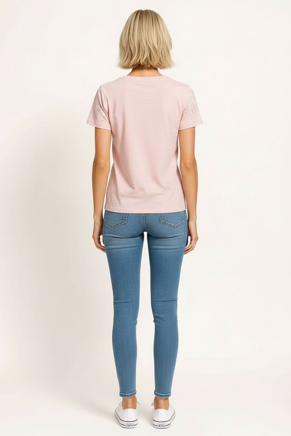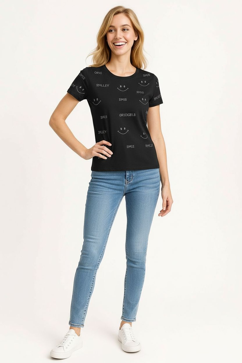 Playera de cuello redondo con aplicaciones distribuidas al frente que aportan textura discreta, manga corta con acabado limpio que asegura comodidad, confección en tejido suave que permite movilidad natural, ajuste clásico que mantiene estructura y soporte