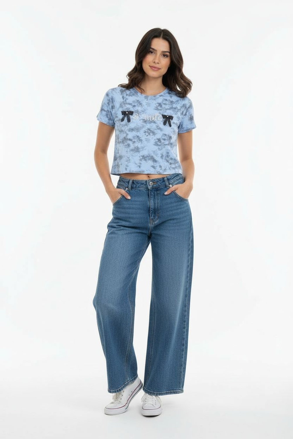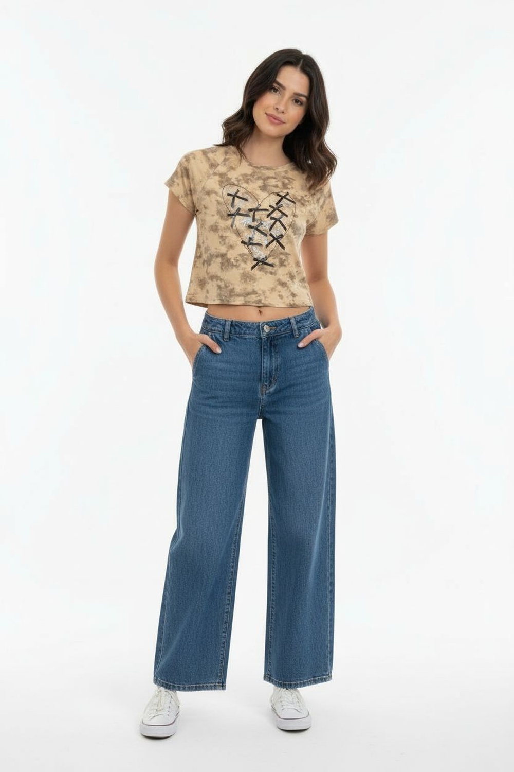 Playera manga corta, cuello redondo, aplicación frontal texturizada, silueta ajustada