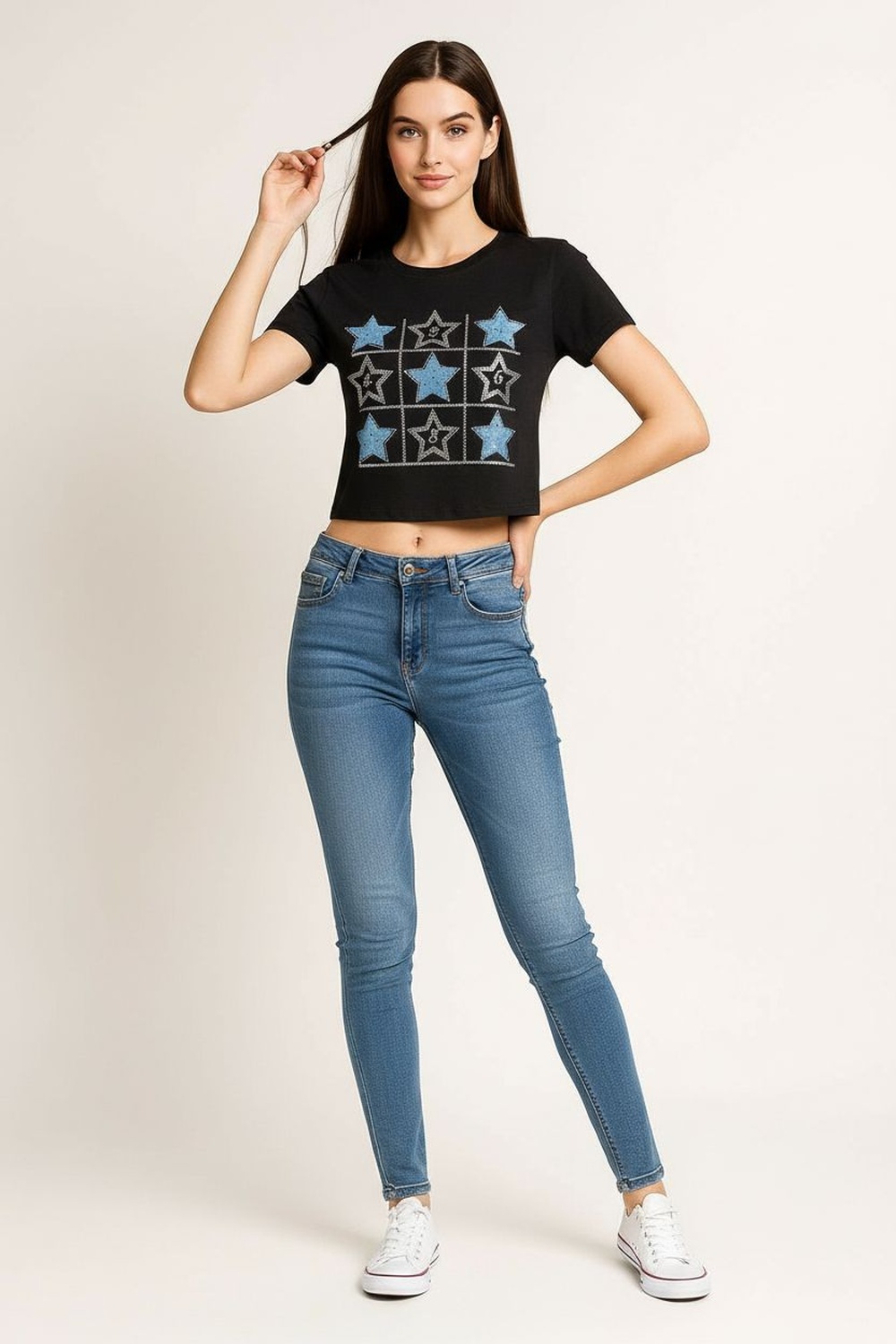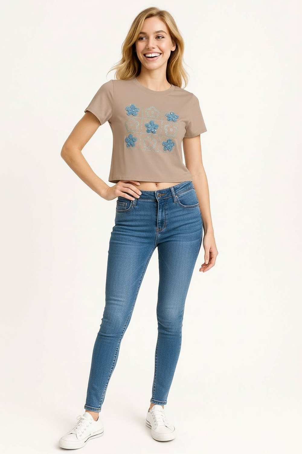 Playera de manga corta con cuello redondo, confeccionada en tejido suave, detalle decorativo al frente con aplicación textil que aporta realce visual, estructura cómoda con caída natural, costado recto que mantiene equilibrio en la silueta