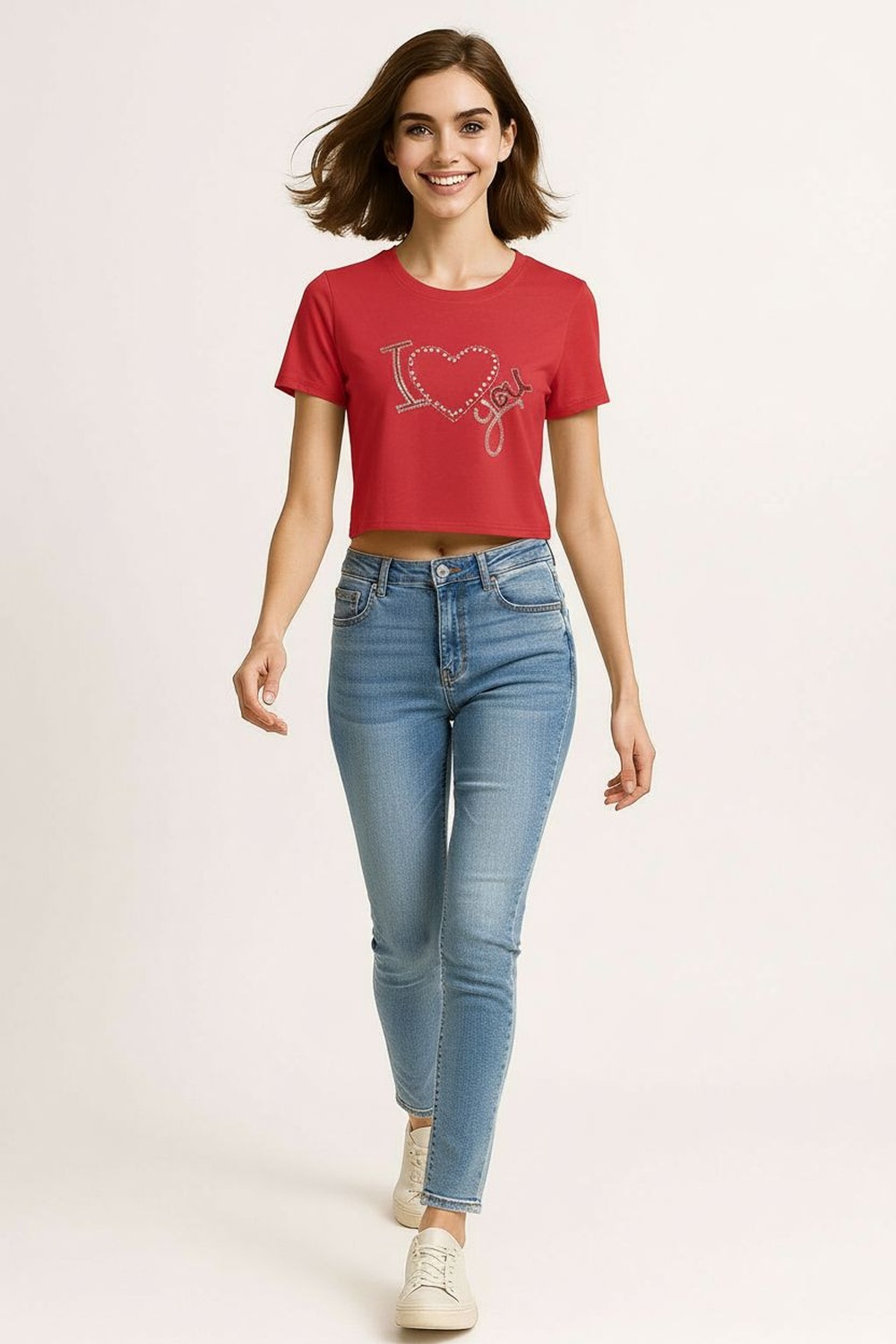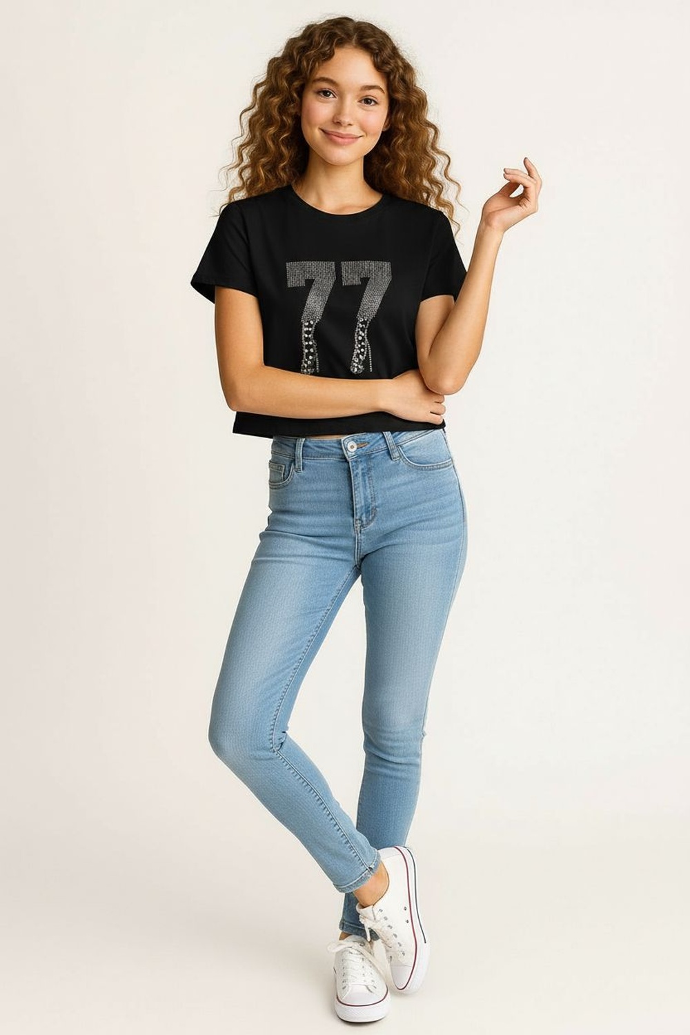 Playera de manga corta con cuello redondo clásico que aporta comodidad, silueta recta con largo a la cintura, confección en tejido suave al tacto que permite transpirabilidad, aplicaciones decorativas al frente colocadas con precisión, acabados prolijos en cuello y mangas que mantienen la forma de la prenda