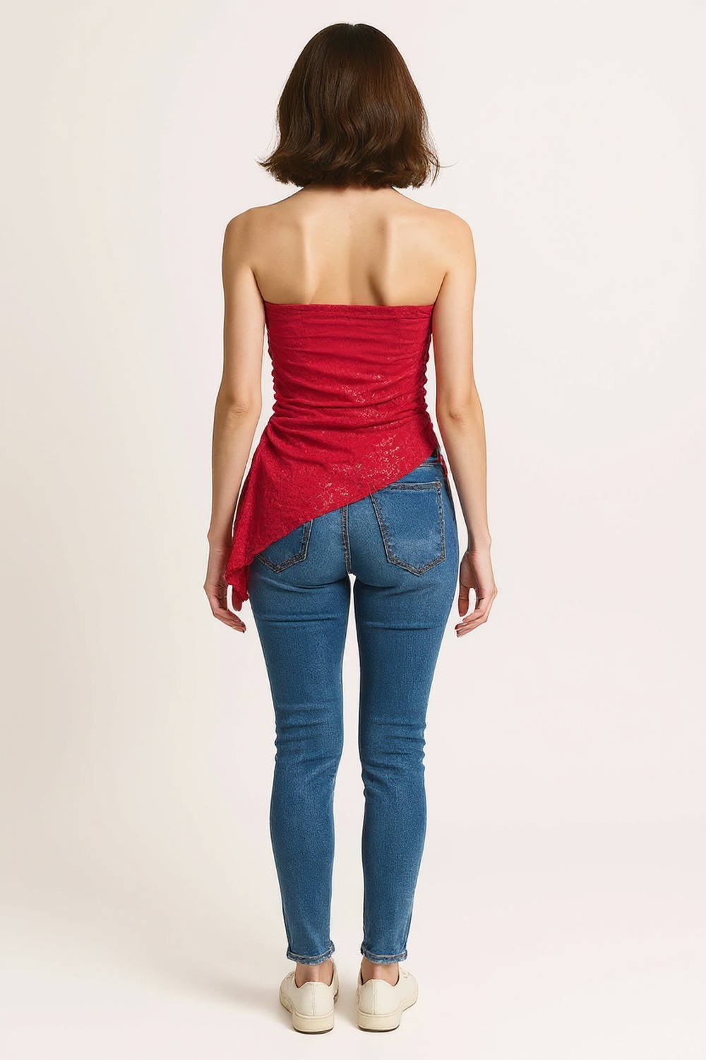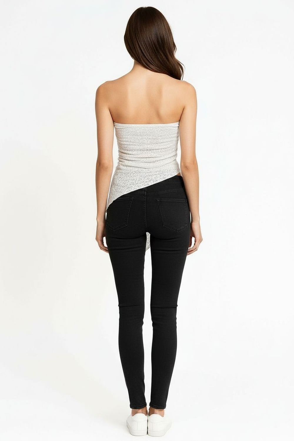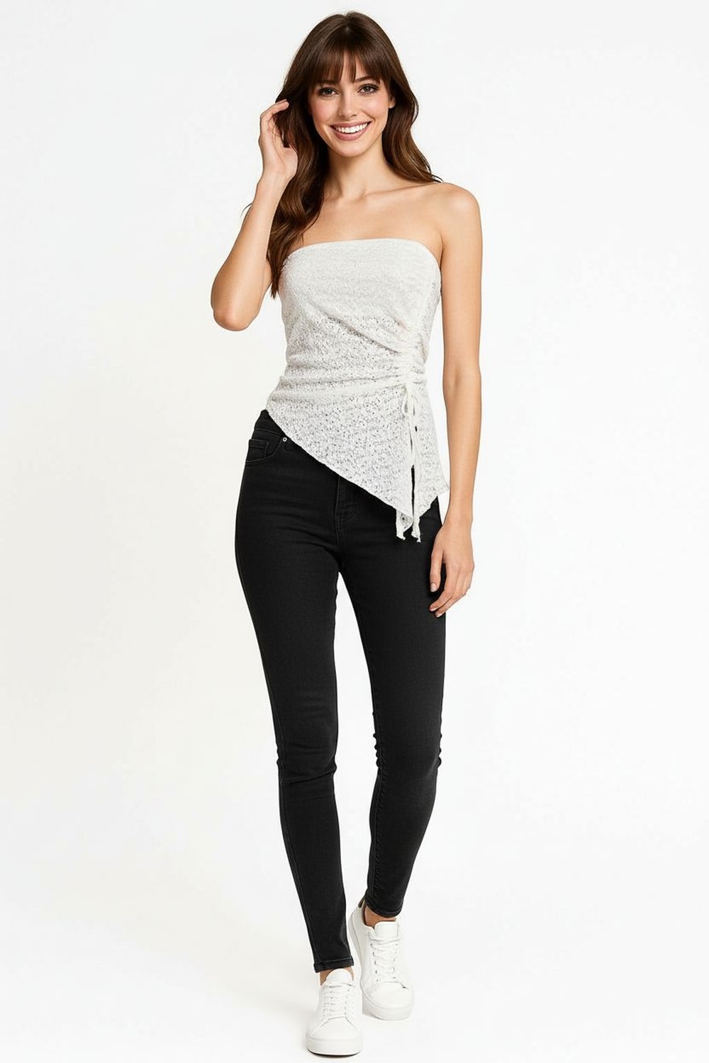Playera tipo banda con escote recto y diseño asimétrico con plisado lateral que genera efecto drapeado, corte irregular en el bajo que aporta dinamismo, confección ligera con textura suave que se adapta al cuerpo, estructura flexible que brinda ajuste cómodo y libertad de movimiento