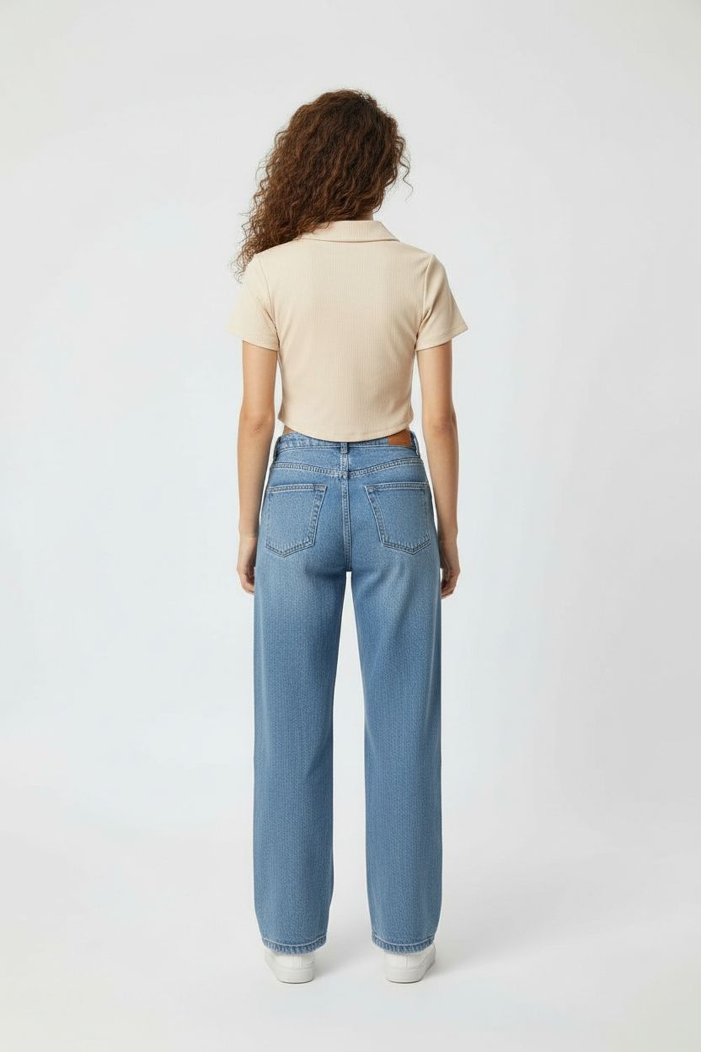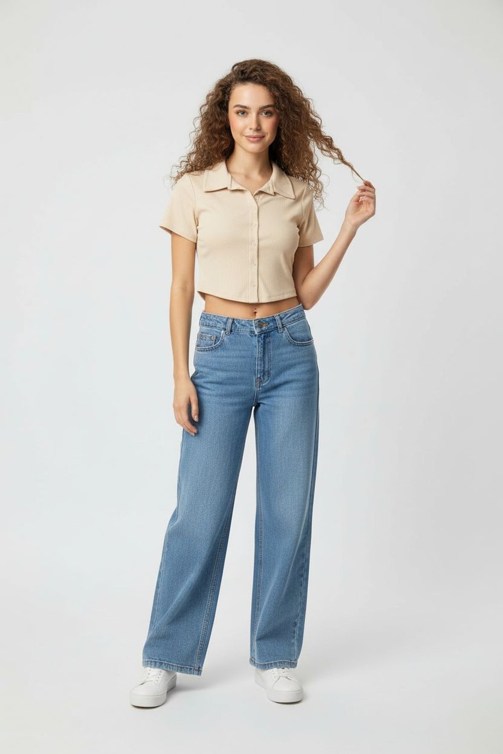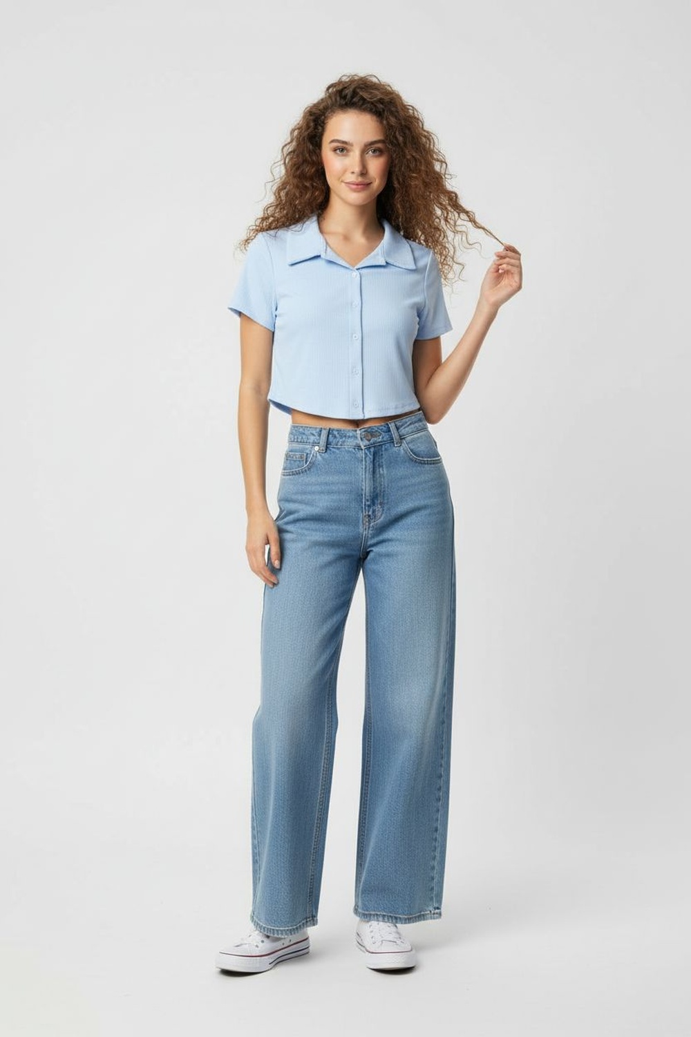 Playera de corte corto con cuello camisero y botones frontales, confeccionada en tejido rib satinado que aporta brillo sutil, mangas cortas con borde contrastante y terminado con volantes decorativos en la basta, diseño estructurado que define la silueta