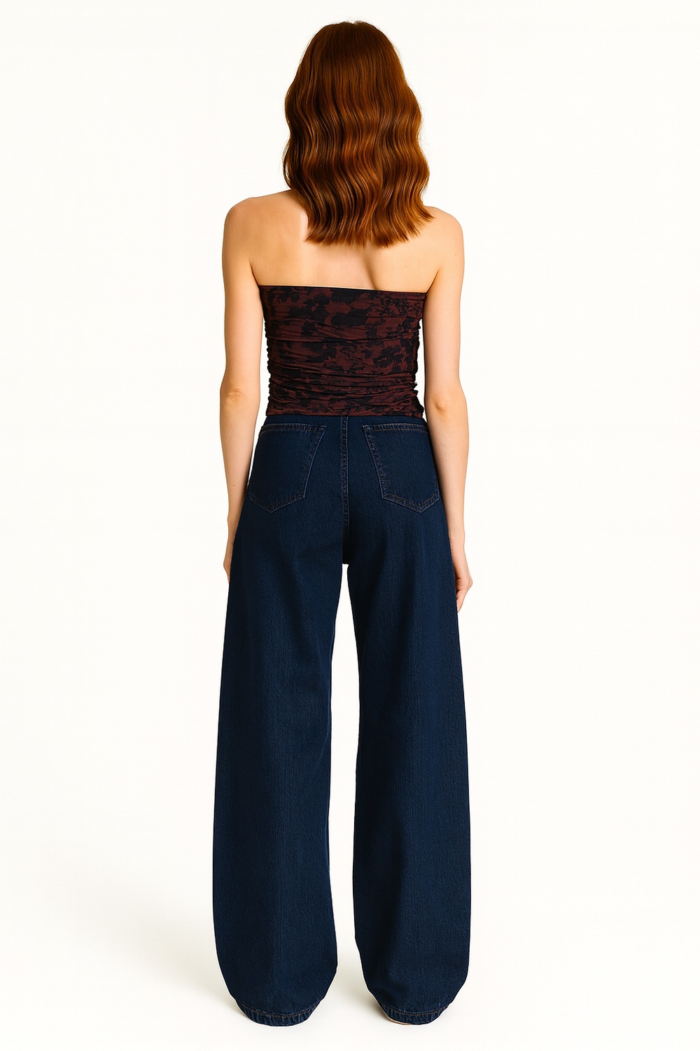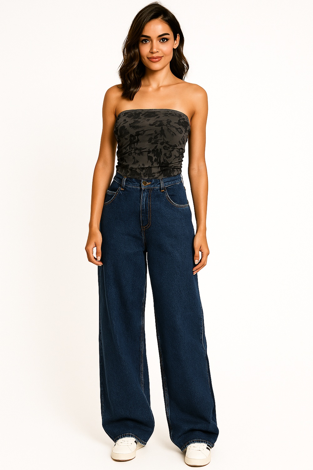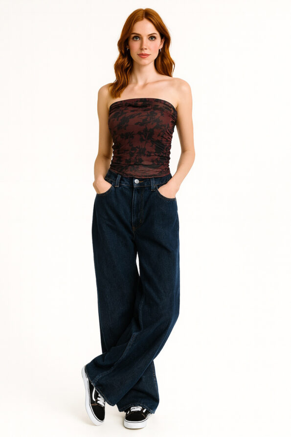 Top tipo banda con delicada capa de encaje sobre base de mesh, tirantes delgados para mayor comodidad, pliegues laterales que aportan ajuste y estilo, confección ligera que permite frescura, ideal para looks juveniles y salidas nocturnas con un toque moderno