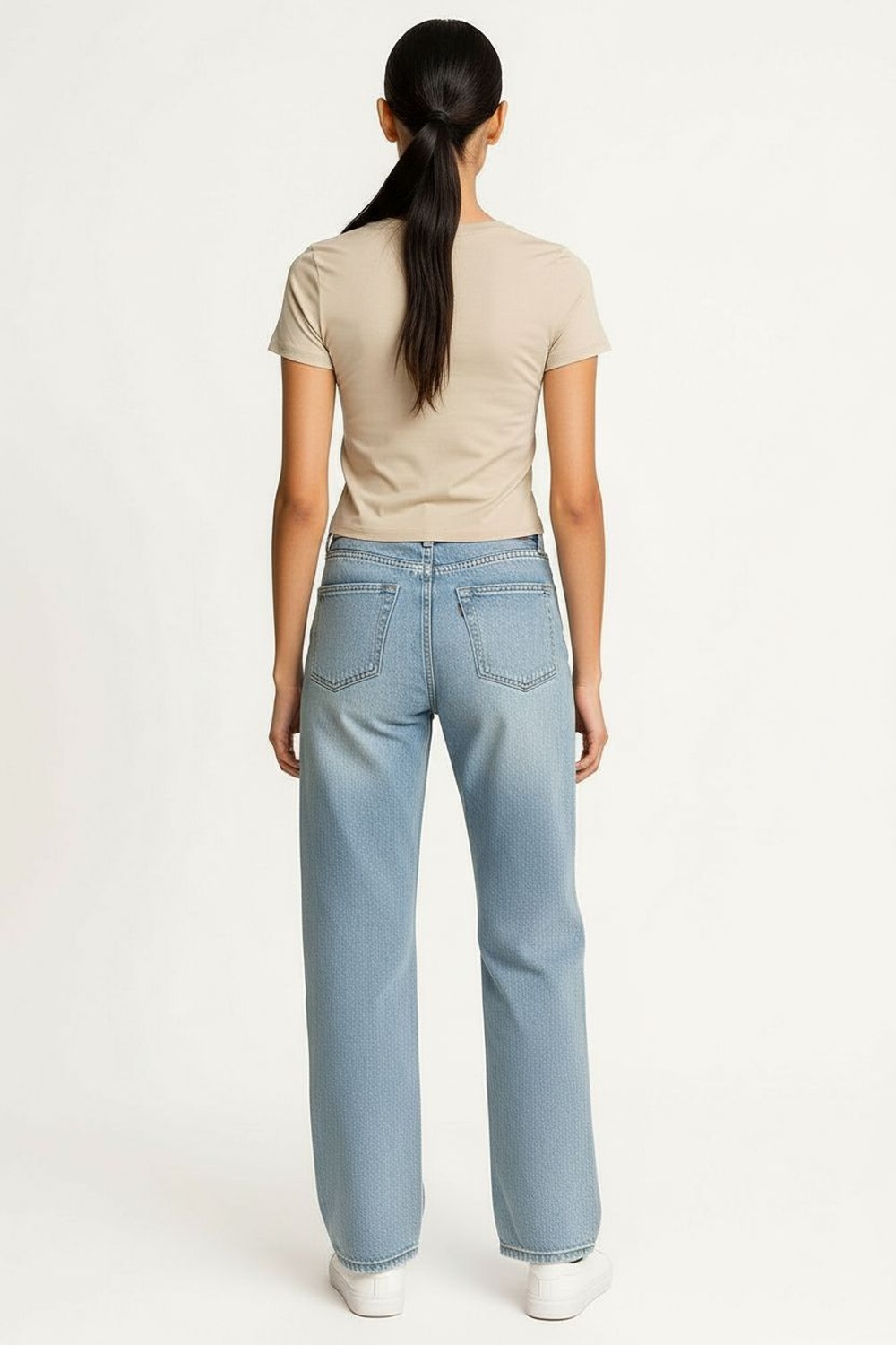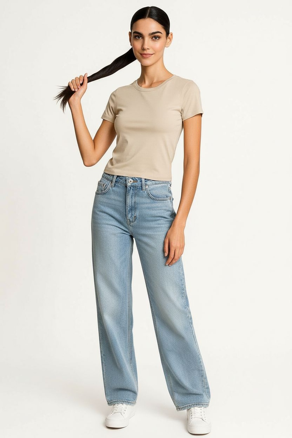 Playera corta de manga corta con cuello redondo y detalle frontal en relieve, silueta recta y terminación a la cintura