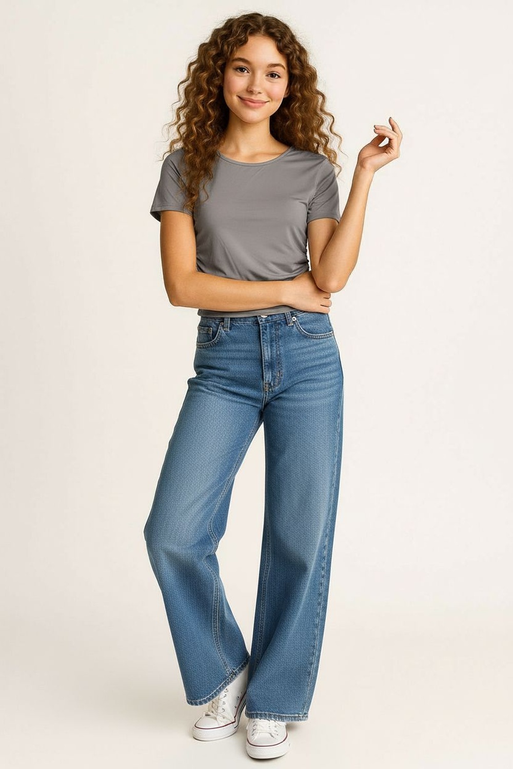 Playera de manga corta con escote redondo, detalle fruncido lateral, estructura ligera, ajuste al cuerpo, acabado suave
