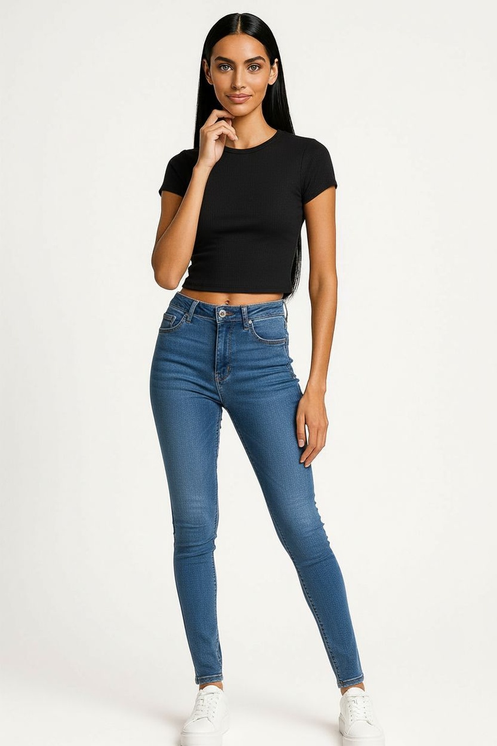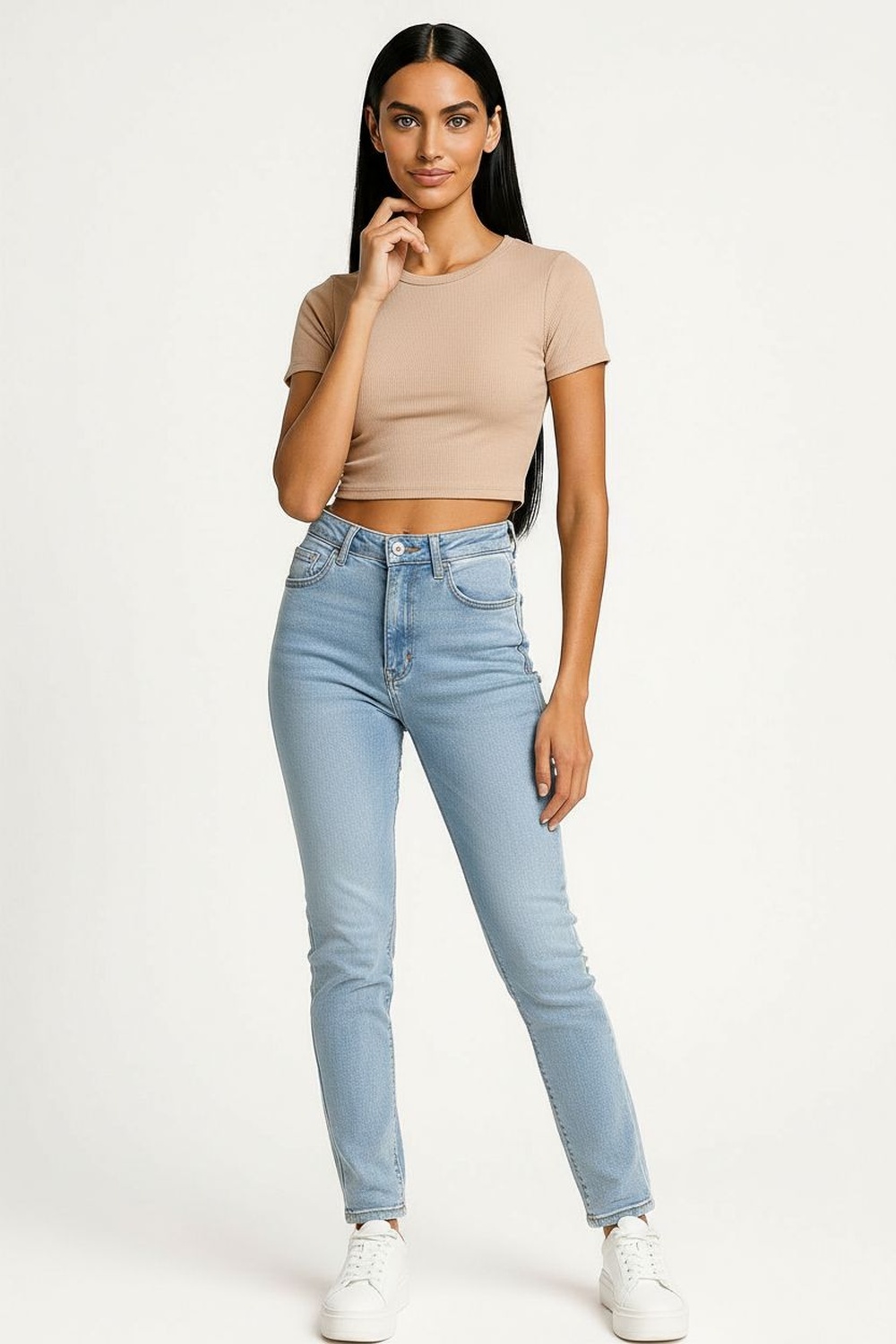 Playera rib corta con acabado acanalado que aporta ajuste cómodo, cuello redondo con borde contrastado que agrega detalle visual, manga corta con terminación ondulada, dobladillo con acabado tipo lechuga que brinda caída ligera, confección de punto suave con estructura definida