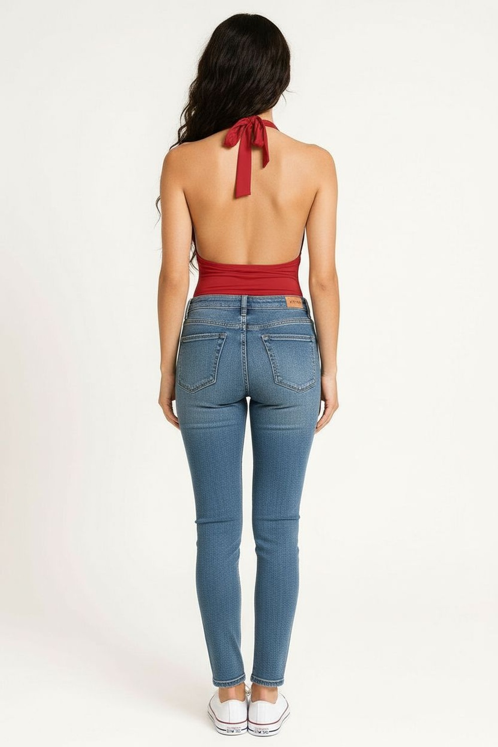 Body tipo playera con corte halter elaborado en tejido elástico, escote profundo al frente que aporta definición al torso, espalda descubierta con amarre en cuello que permite ajuste personalizado, diseño ajustado que se adapta al cuerpo, acabado suave que brinda confort continuo