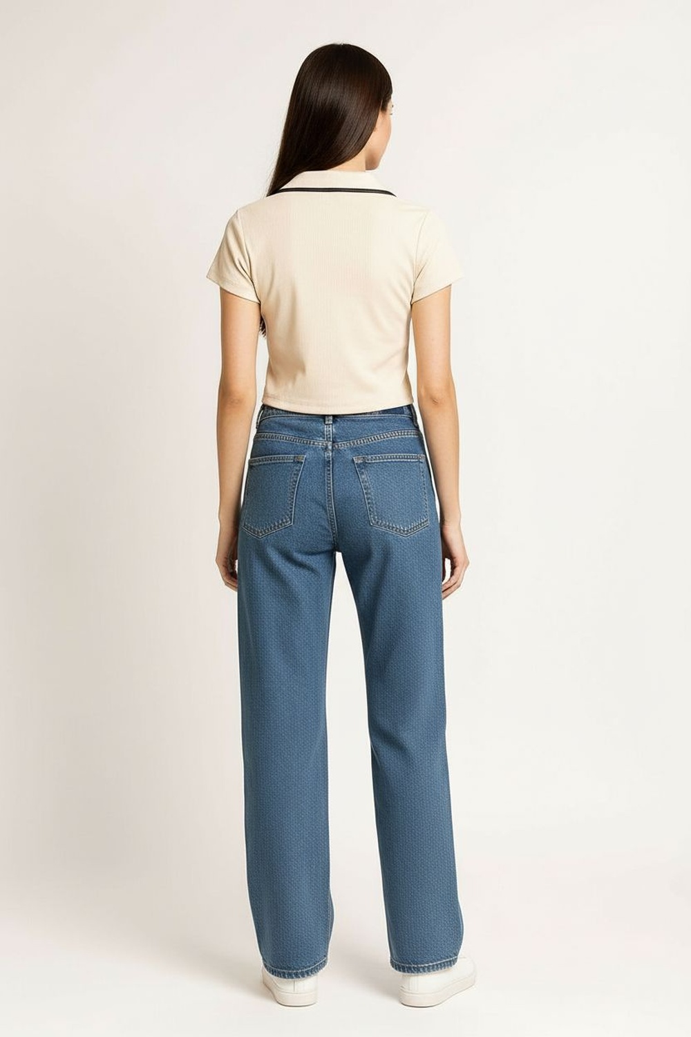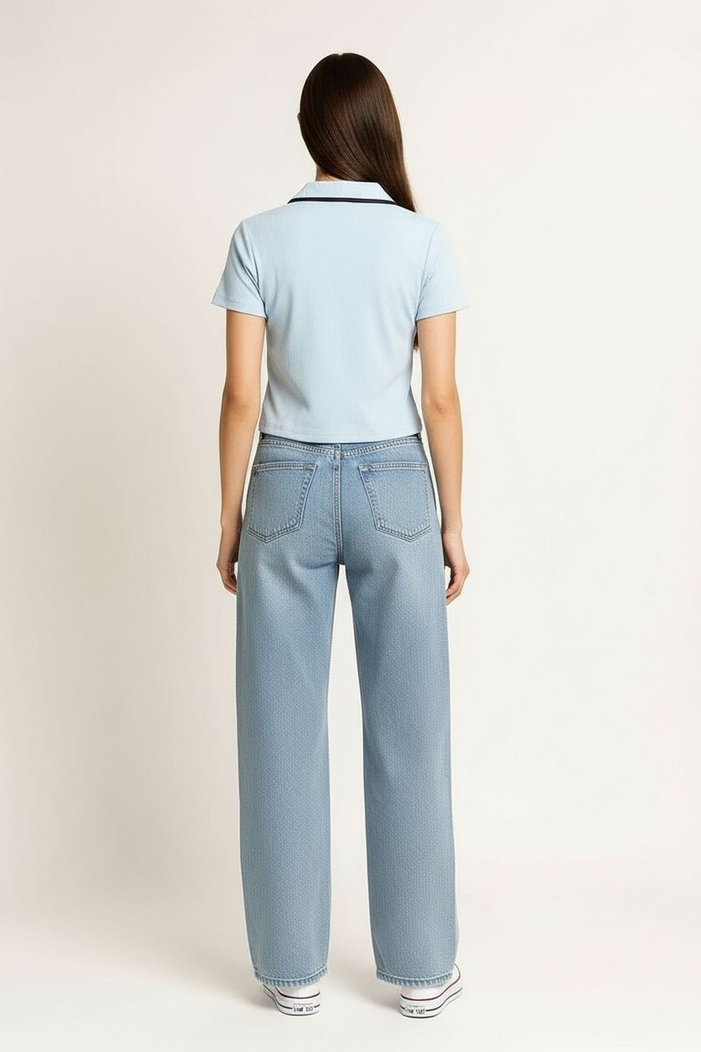Playera tipo polo con cuello camisero, escote en V, manga corta, ajuste al cuerpo, largo arriba de la cintura, tejido ligero, terminados limpios
