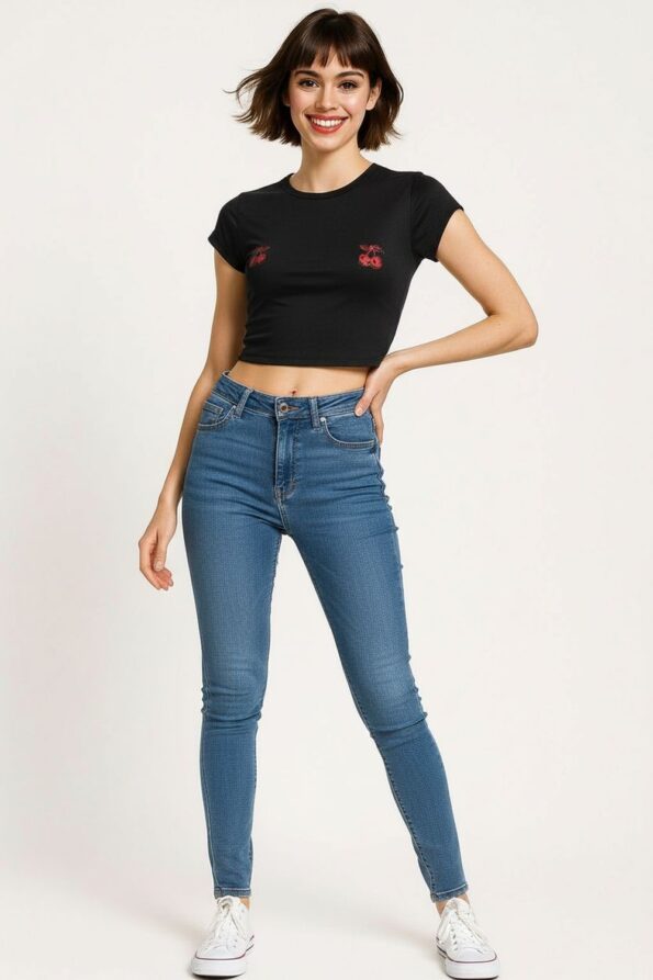 Playera de manga corta confeccionada en tejido brush de tacto suave que ofrece comodidad, diseño con estampado frontal que añade un detalle moderno y divertido, cuello redondo con acabado reforzado, corte crop que realza la cintura, estructura ligera con costuras planas que mantienen una silueta limpia y actual