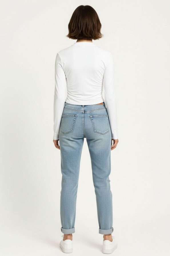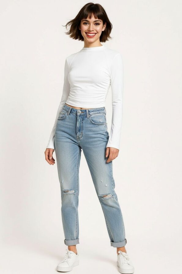 Jeans de tiro medio con corte recto que ofrece comodidad y estilo urbano, diseño con roturas al frente que aportan un toque moderno y desenfadado, bolsillos funcionales delanteros y traseros que brindan practicidad, cierre frontal con botón metálico y cierre de cremallera, confeccionados en mezclilla resistente con acabado suave al tacto que permite libertad de movimiento
