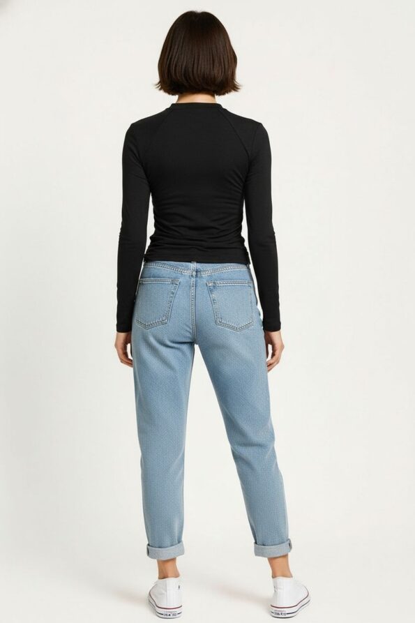Playera de algodón con manga larga y cuello redondo que ofrece confort y estilo urbano, diseño con estampado frontal y posterior que aporta un toque moderno y juvenil, corte corto que resalta la cintura, confección en tejido de punto suave que brinda frescura y libertad de movimiento, acabado limpio con costuras finas que garantizan una apariencia cuidada y versátil