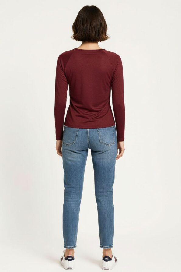 Playera de manga larga con confección en tejido brush de textura suave, diseño con plizado lateral que estiliza el contorno del cuerpo, cuello redondo clásico que aporta un toque minimalista, estructura ajustada que se adapta cómodamente a la silueta, acabado limpio en dobladillos y costuras que refuerzan la durabilidad y mantienen una apariencia pulida