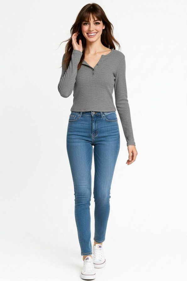 Playera de manga larga confeccionada en tejido chenille de tacto suave que aporta confort y calidez, escote con abertura en forma de pico y botón al tono que da un toque moderno, corte ajustado que resalta la figura, estructura ligera con caída natural, acabados limpios que garantizan durabilidad y una apariencia pulida