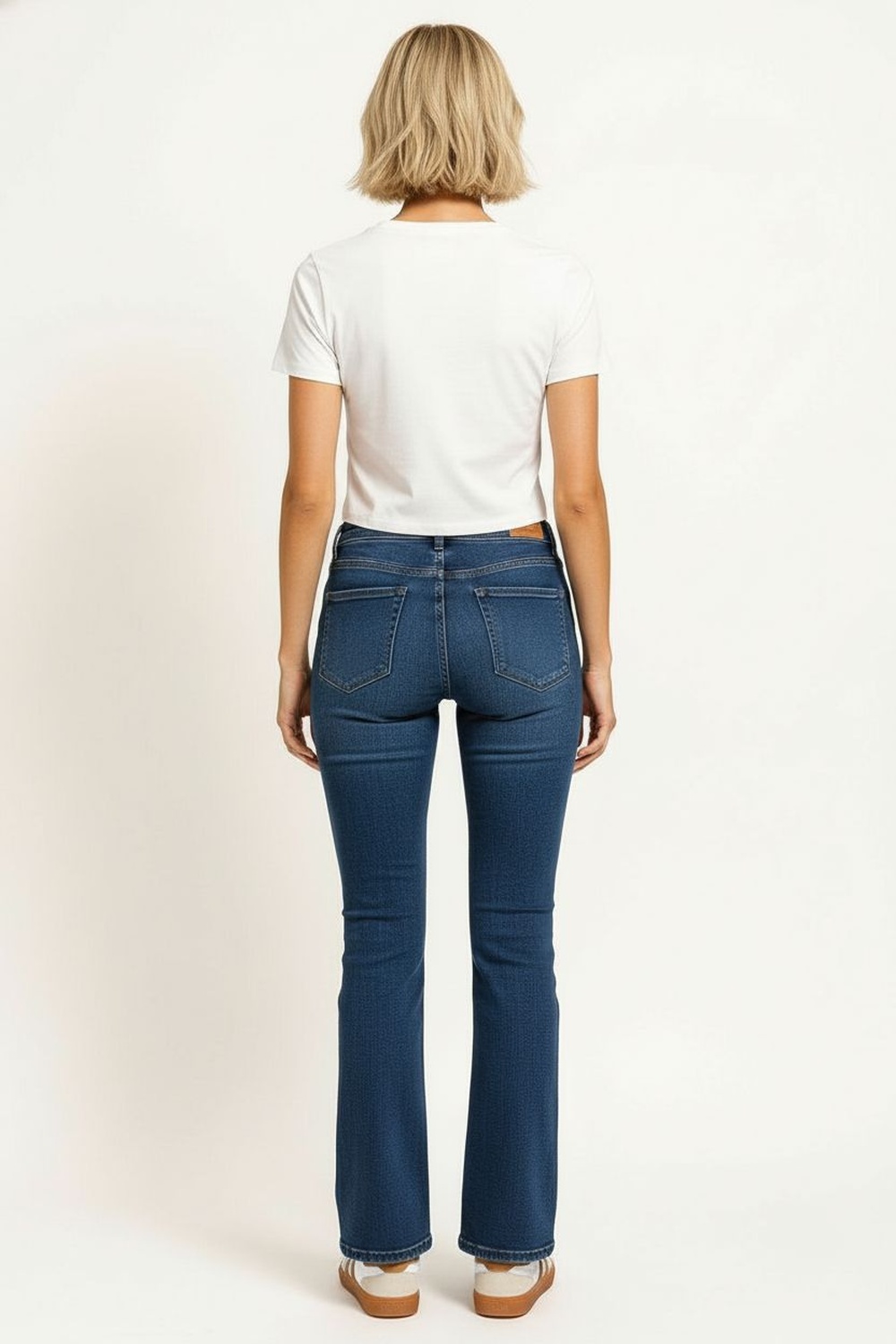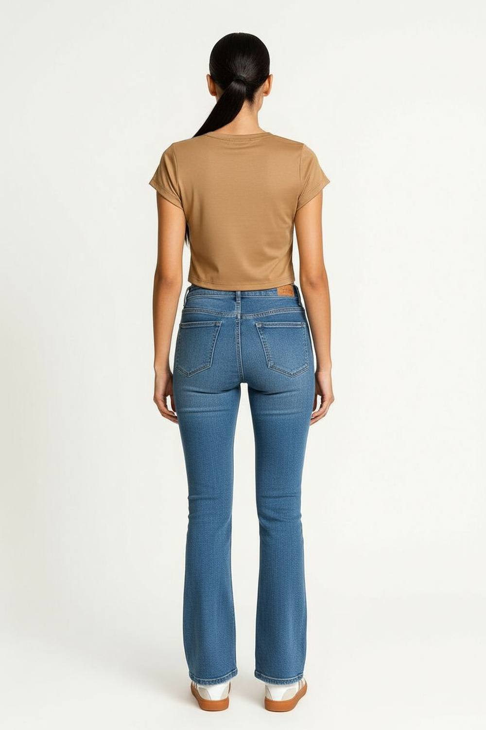 Jeans de tiro alto con corte de pierna amplia que aporta comodidad y estructura, pretina firme con botón metálico y pasadores que permiten ajuste seguro, cinco bolsillos funcionales con acabado resistente, fabricación en mezclilla de grosor medio que brinda soporte y mejor caída
