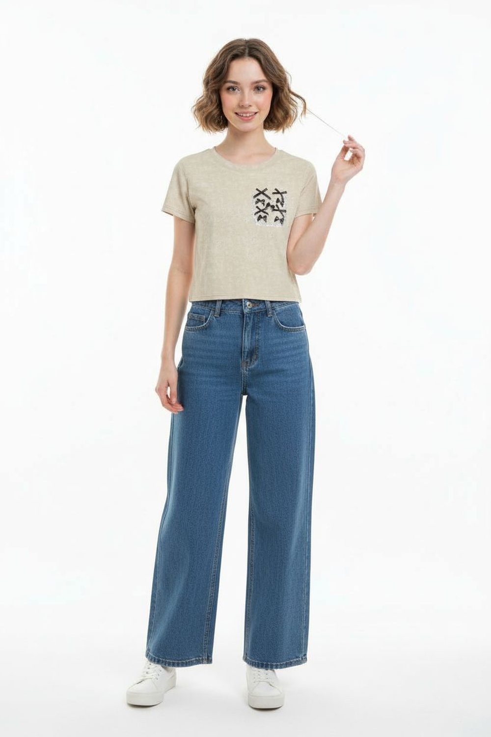 Playera tipo crop con cuello redondo, manga corta, estructura ligera, corte recto con caída suave, acabado limpio en bordes y confección cómoda para uso diario