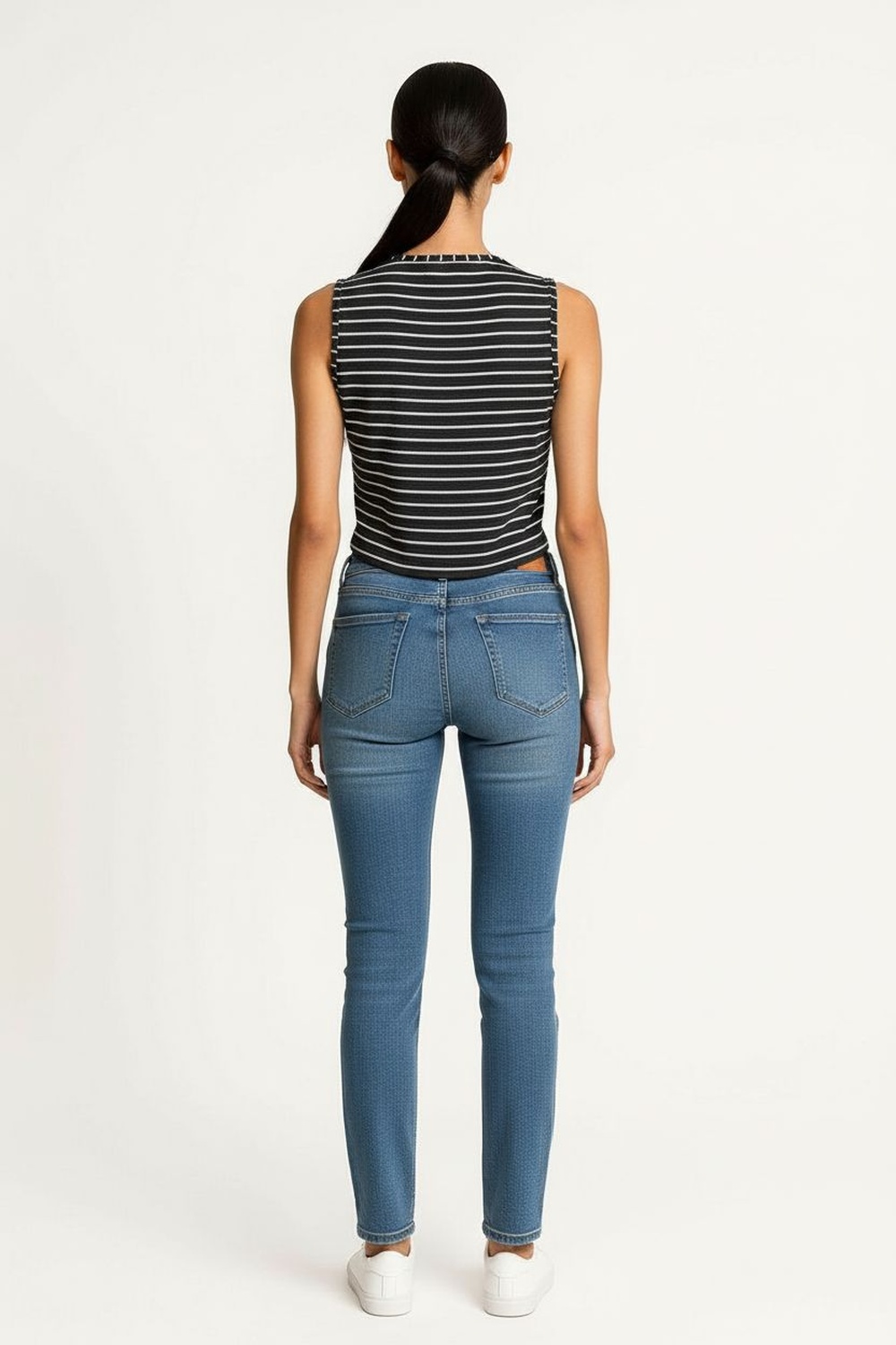Playera sin mangas con escote en V que alarga visualmente el torso, botonadura frontal funcional que facilita el uso, tejido con textura integrada que aporta interés visual, corte corto con terminación recta, estructura ligera que permite comodidad durante todo el día