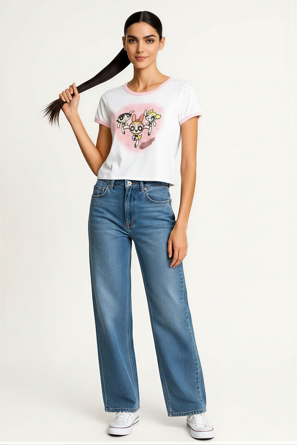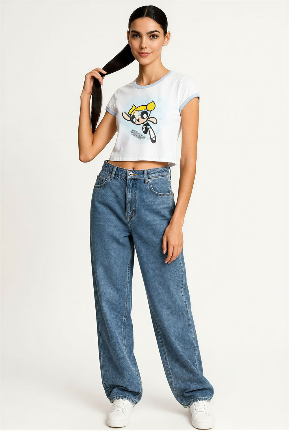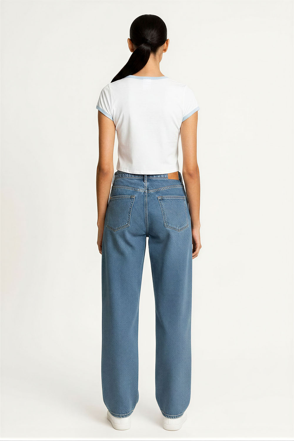Jeans de tiro alto con cierre frontal y botón metálico que brinda ajuste seguro, corte wide leg con pierna amplia que permite libertad de movimiento, diseño de cinco bolsas funcionales que aportan practicidad, confección en mezclilla resistente que ofrece durabilidad, pretina estructurada que mejora el ajuste en cintura