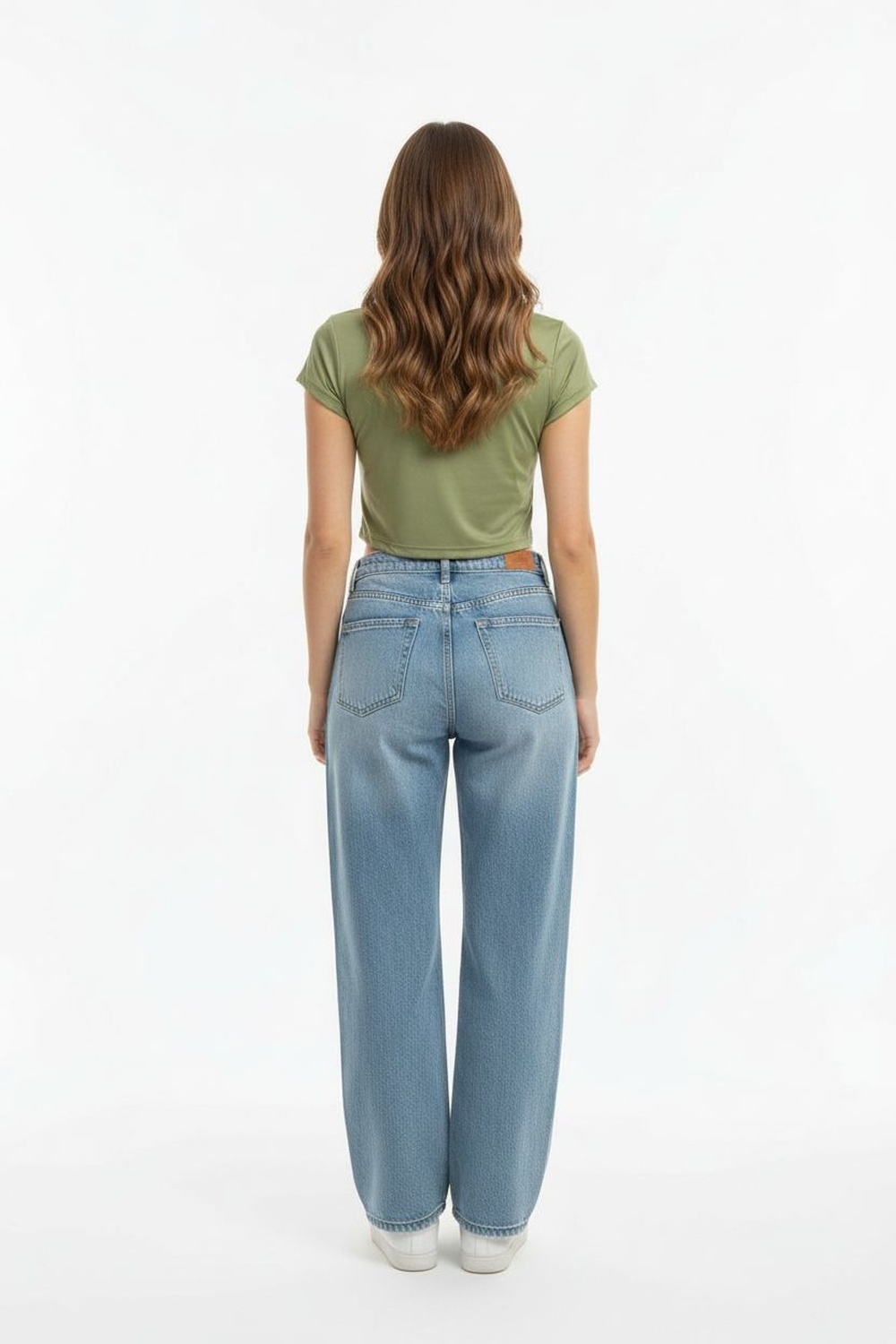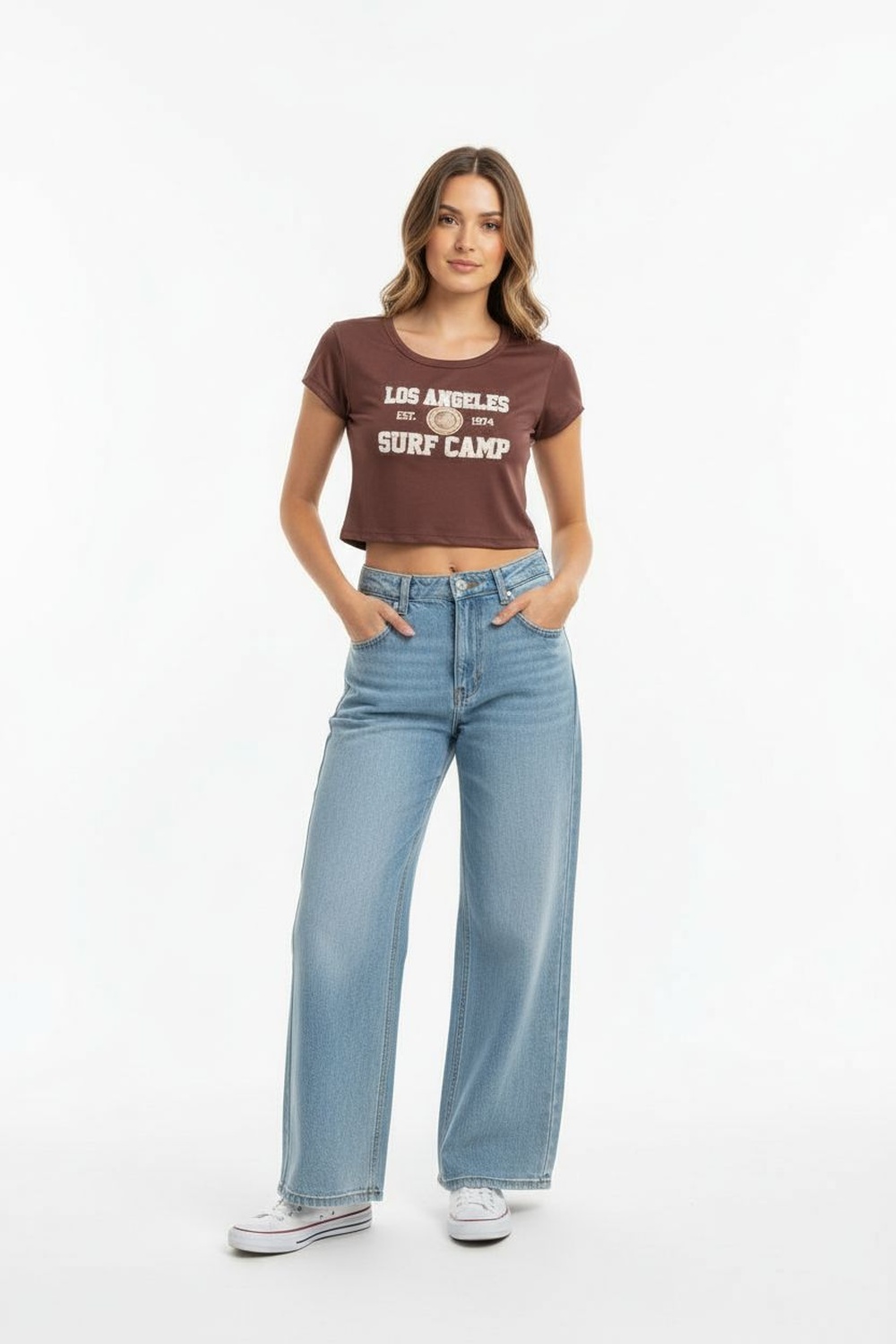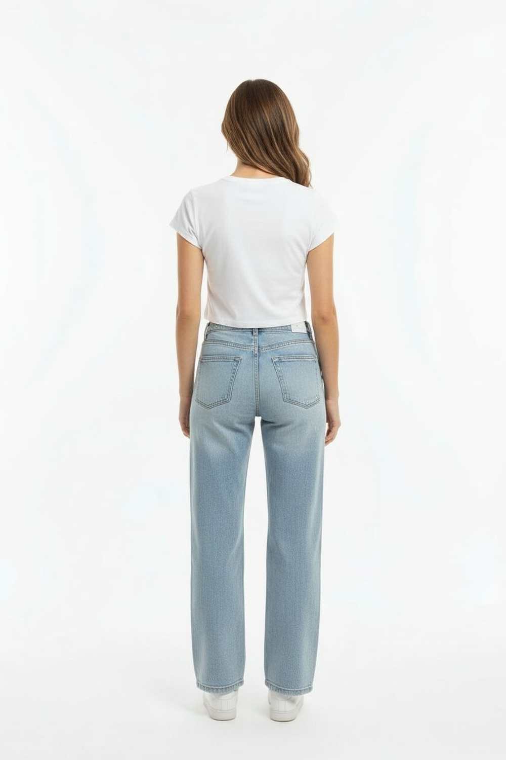 Playera corta de manga corta con cuello redondo y detalle frontal en relieve, silueta recta y terminación a la cintura