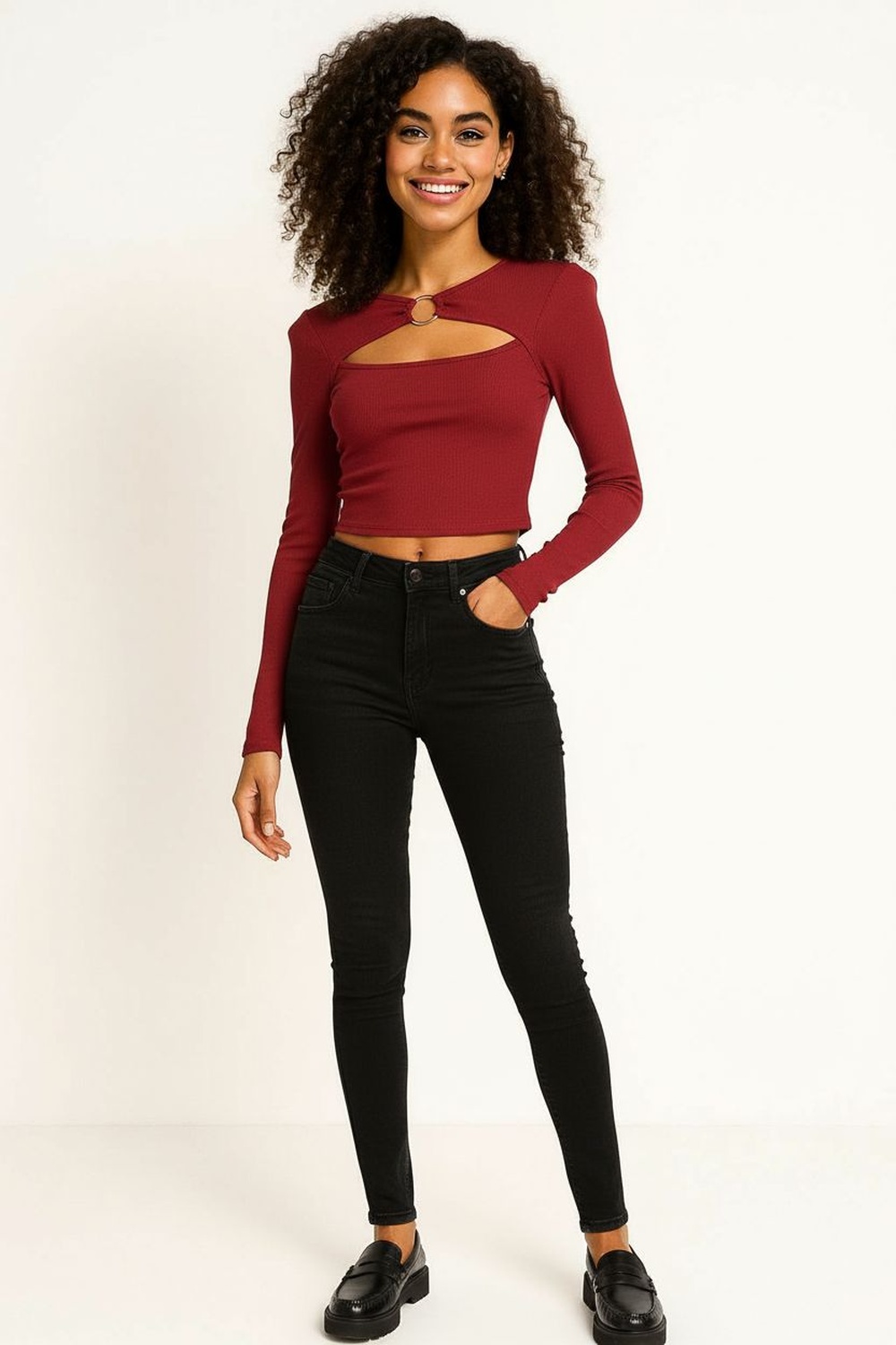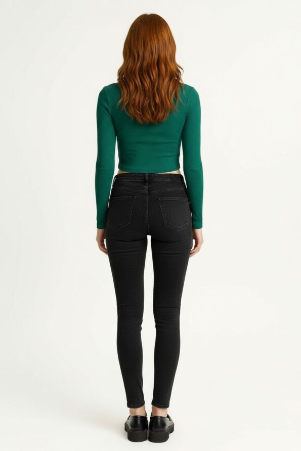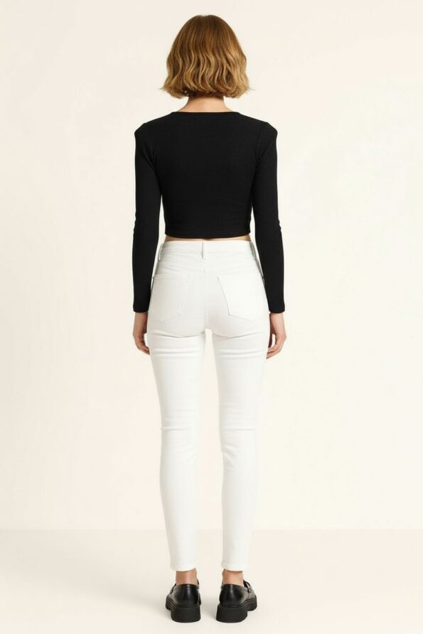 Playera de manga larga confeccionada en tejido rib con corte ajustado que resalta la silueta, escote con abertura frontal y detalle de anilla metálica que aporta un estilo moderno y atrevido, diseño corto por encima de la cintura que estiliza y brinda un look juvenil, material elástico y suave que asegura comodidad y libertad de movimiento, acabados reforzados que garantizan durabilidad