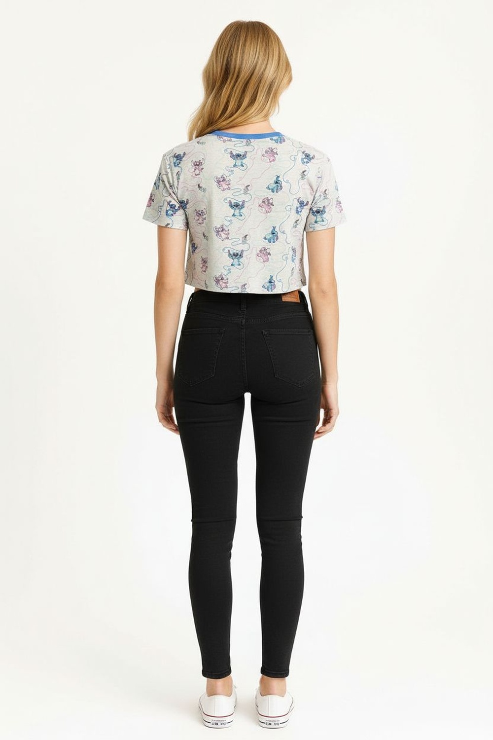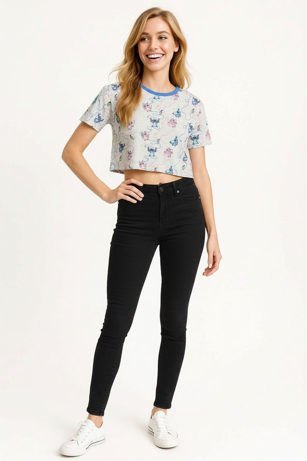 Playera corta de manga corta confeccionada en algodón suave que brinda frescura, cuello redondo clásico con terminaciones reforzadas, silueta crop que estiliza la figura, aplicación gráfica en el frente que aporta un detalle distintivo, costuras resistentes que aseguran mayor durabilidad