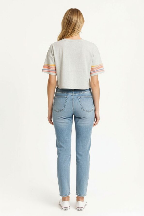 Playera de manga corta con diseño crop que realza la cintura y aporta un estilo juvenil, cuello redondo que brinda comodidad y un ajuste clásico, confección en tejido suave y ligero que favorece la frescura, acabados resistentes en mangas y basta que aseguran durabilidad y comodidad en el uso diario