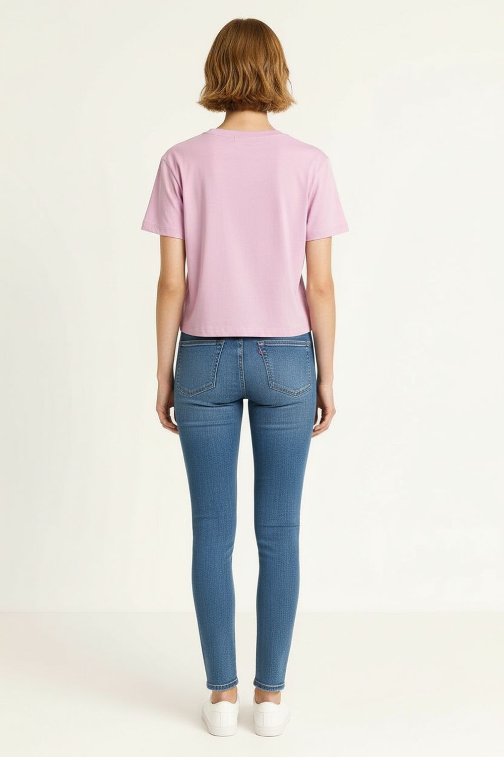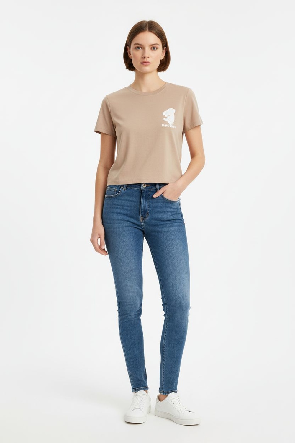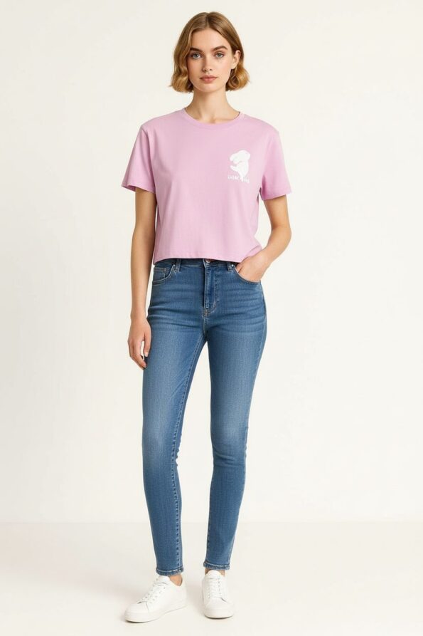 Playera corta de manga corta confeccionada en algodón suave que brinda frescura, cuello redondo clásico con terminaciones reforzadas, silueta crop que estiliza la figura, aplicación gráfica en el frente que aporta un detalle distintivo, costuras resistentes que aseguran mayor durabilidad