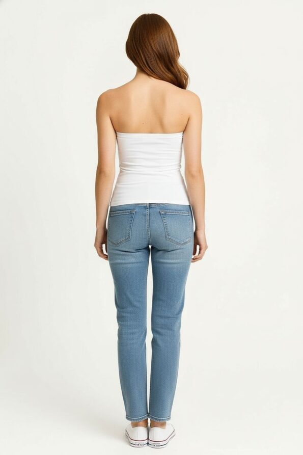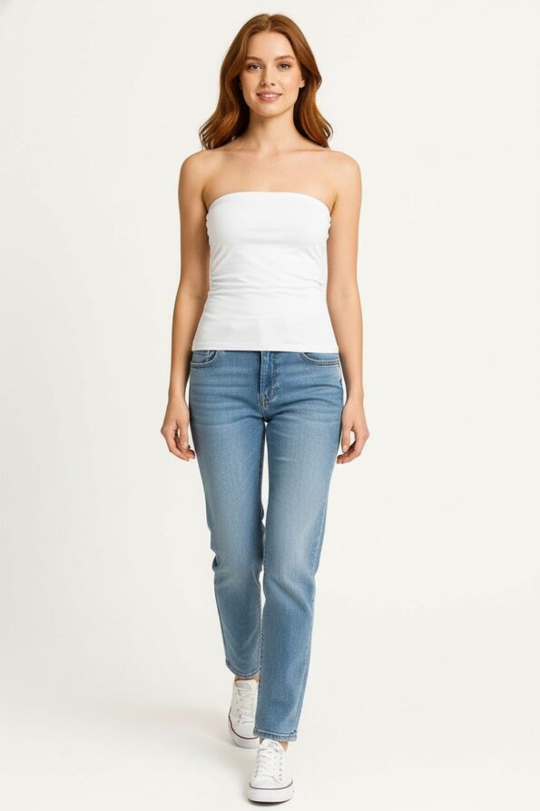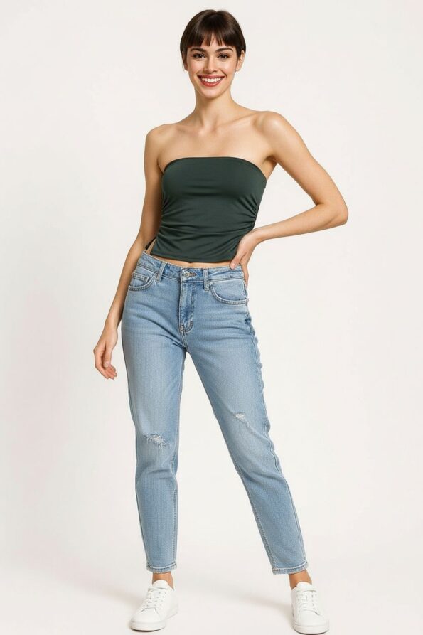 Top tipo banda de confección colombiana con detalle fruncido que realza la figura, ajuste superior con elástico interno que brinda soporte y comodidad, tejido suave al tacto que se adapta al cuerpo, diseño con abertura discreta que aporta un toque moderno y femenino, acabado limpio en bordes para un look pulido y contemporáneo