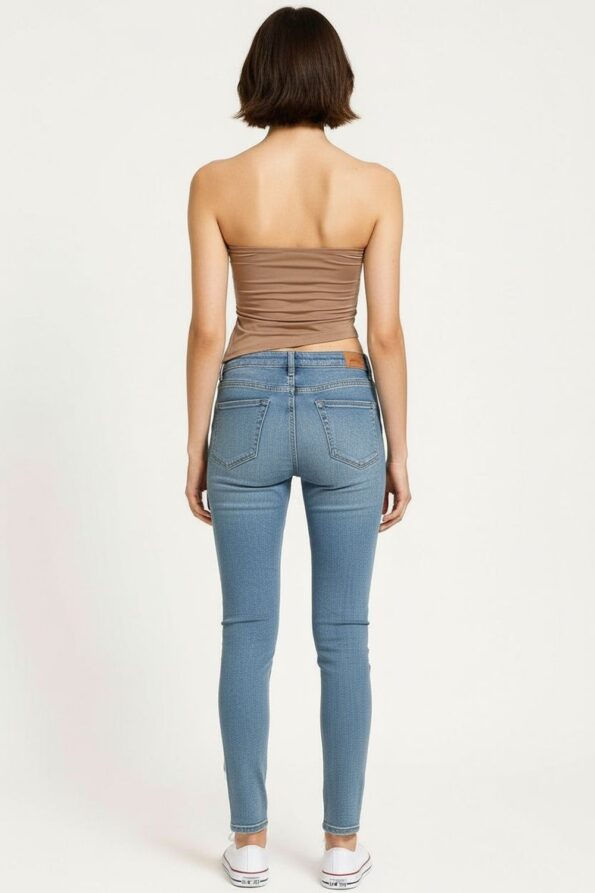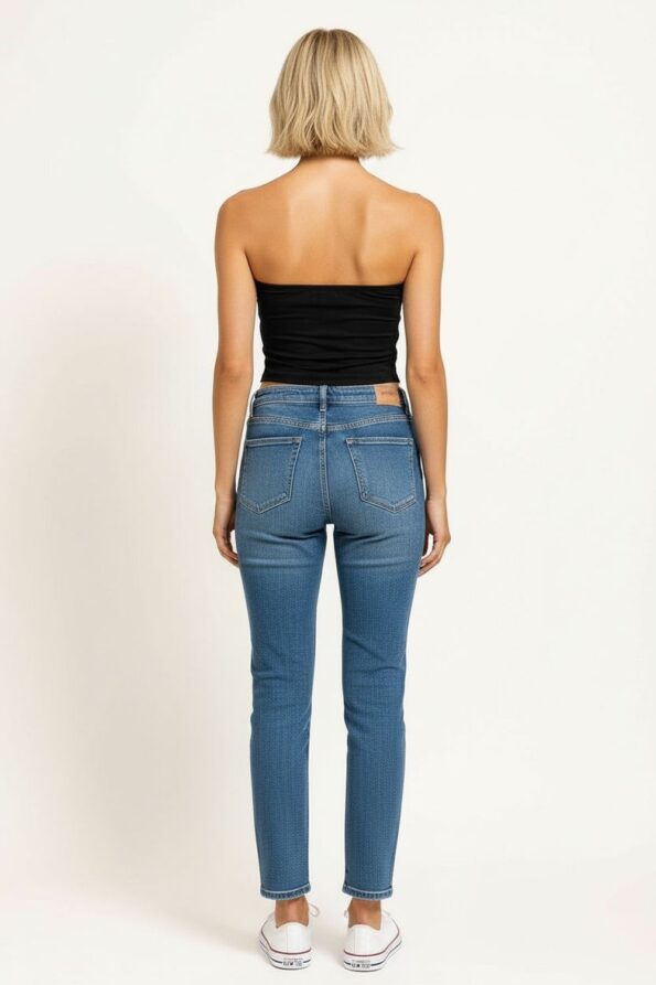 Jeans mom tiro medio, pretina ancha con trabas, botón, zipper, bolsas y pespunte contraste