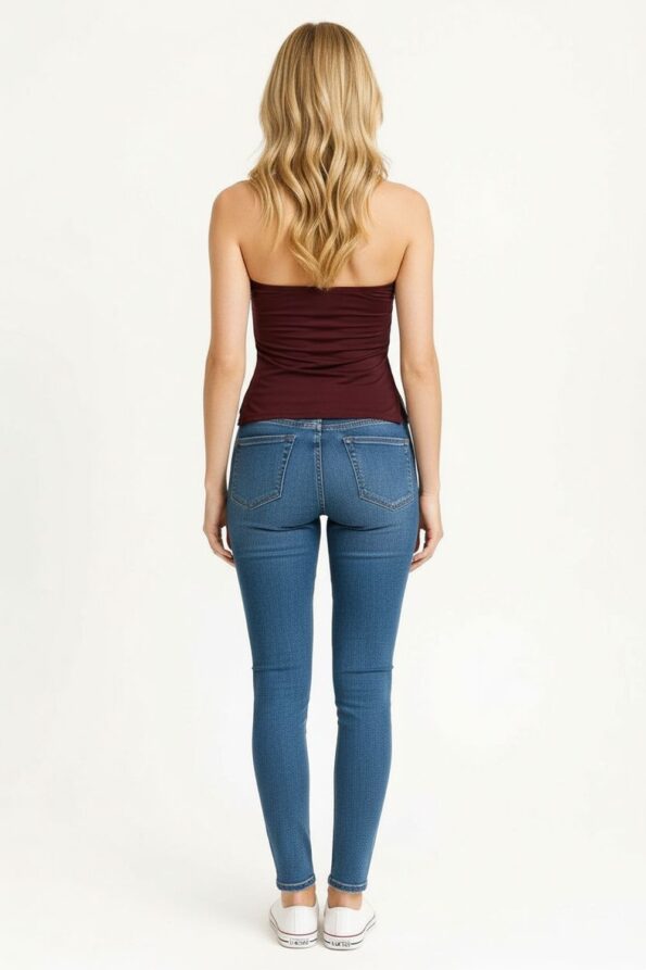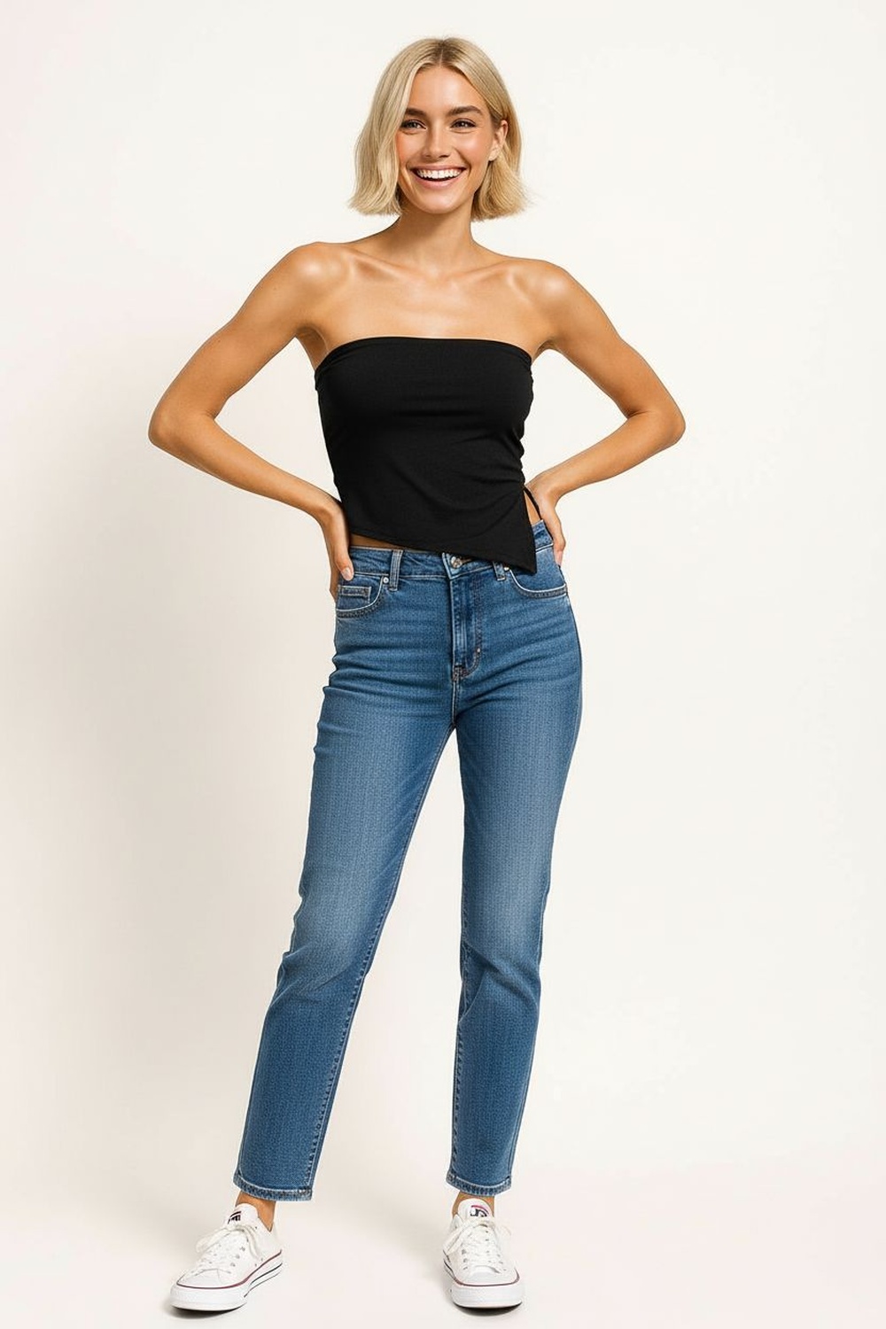 Playera tubo crop con diseño liso, corte asimétrico en pico con abertura lateral