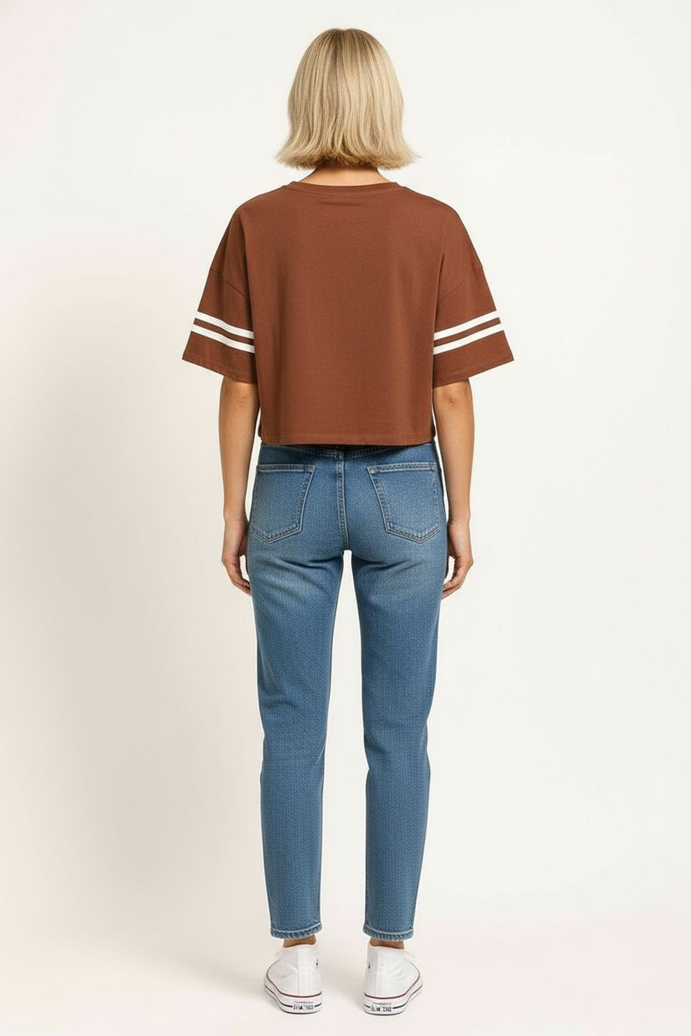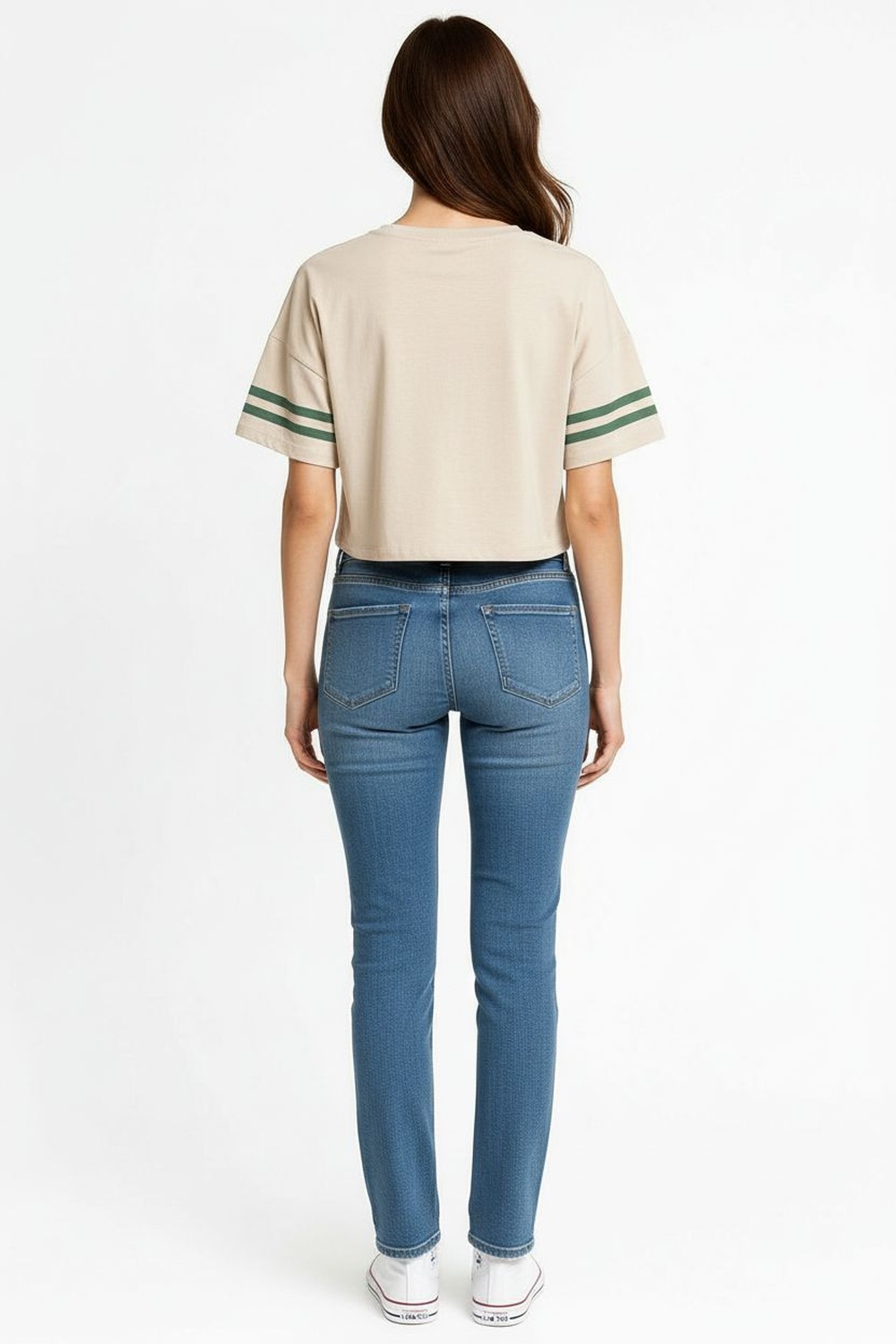 Playera corta de manga amplia con cuello redondo y diseño estampado al frente, detalles en contraste en las mangas que aportan estilo casual, confección en tejido de algodón que ofrece suavidad y frescura, dobladillo recto que brinda ajuste cómodo y moderno