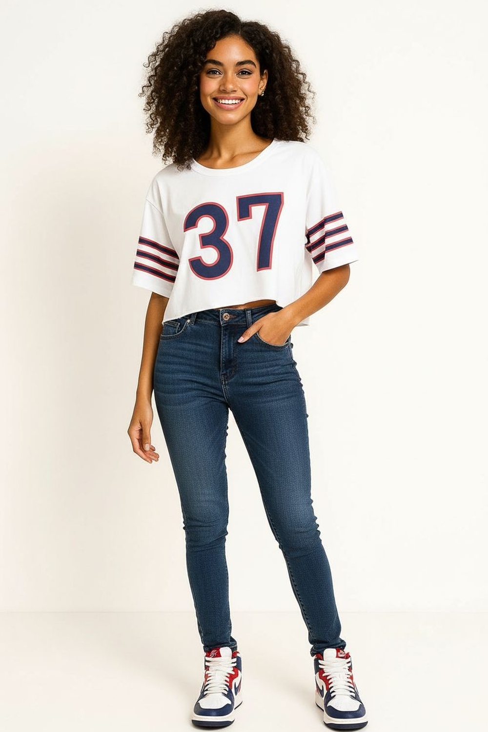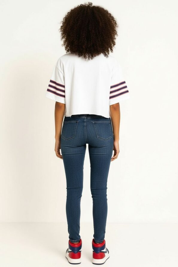Playera corta de cuerpo suelto con corte crop terminado al natural que aporta un estilo relajado y moderno, cuello redondo clásico que brinda comodidad, mangas cortas con franjas decorativas que evocan inspiración deportiva, confección ligera y fresca que permite movilidad, prenda versátil que se adapta a looks casuales y urbanos con un aire juvenil