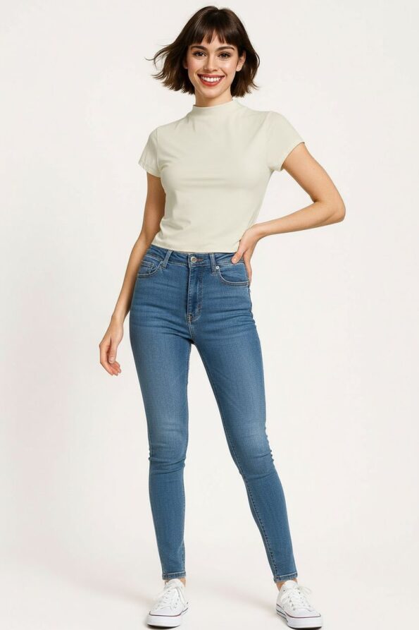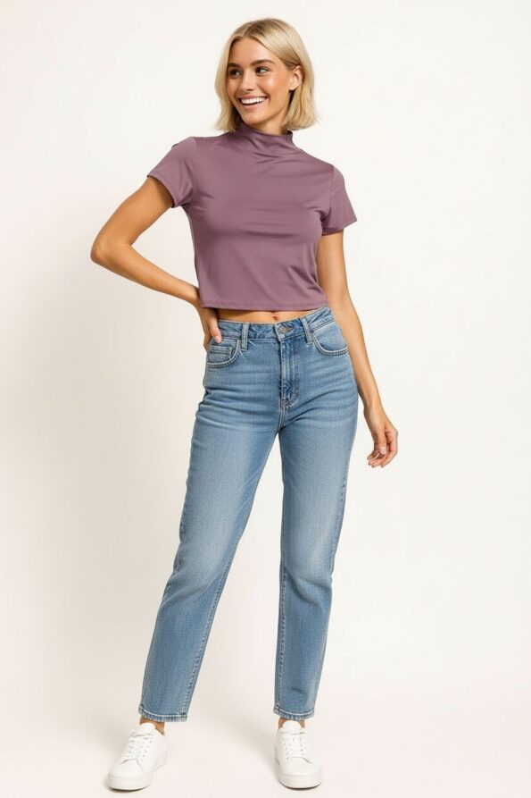 Playera crop de confección colombiana con cuello alto que estiliza el cuello y aporta elegancia, manga corta con acabado liso que se ajusta suavemente al brazo, tejido elástico de textura suave que brinda confort y libertad de movimiento, corte corto que realza la figura y permite un look moderno, terminaciones limpias que garantizan un acabado pulido